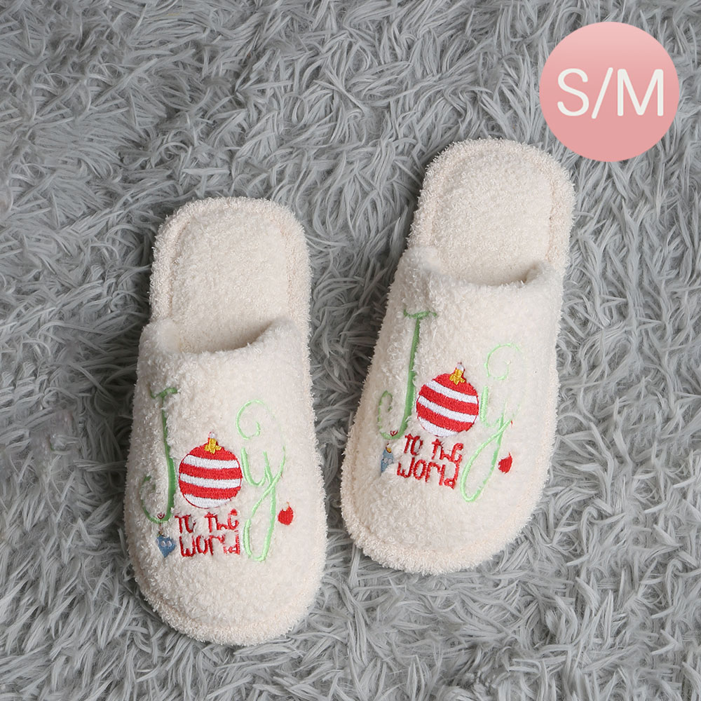 Details • Size : S/M (Women 6-8, Men 5-7) • Material : 100% Poly. Microfiber • Festive indoor slippers featuring "Joy to the World" embroidery with ornament accents. Designed in S/M size for a cozy seasonal fit, perfect for relaxing at home during the holidays.