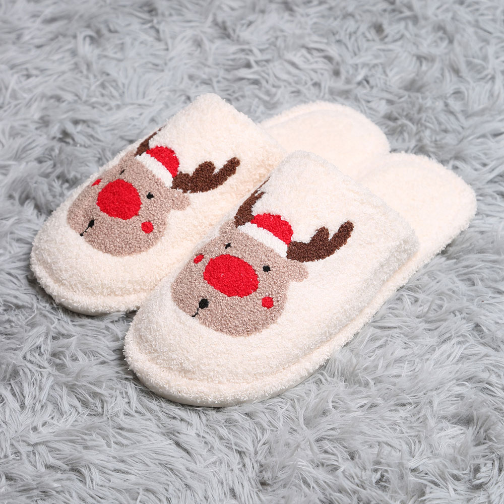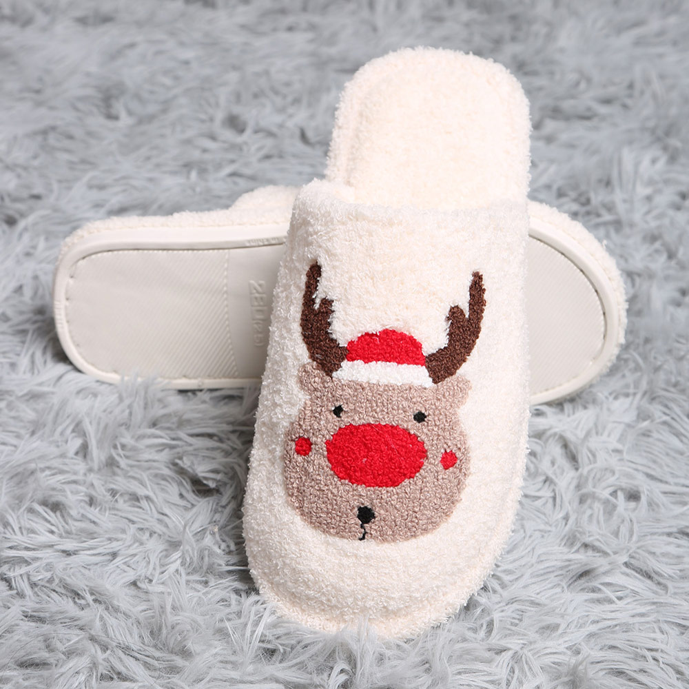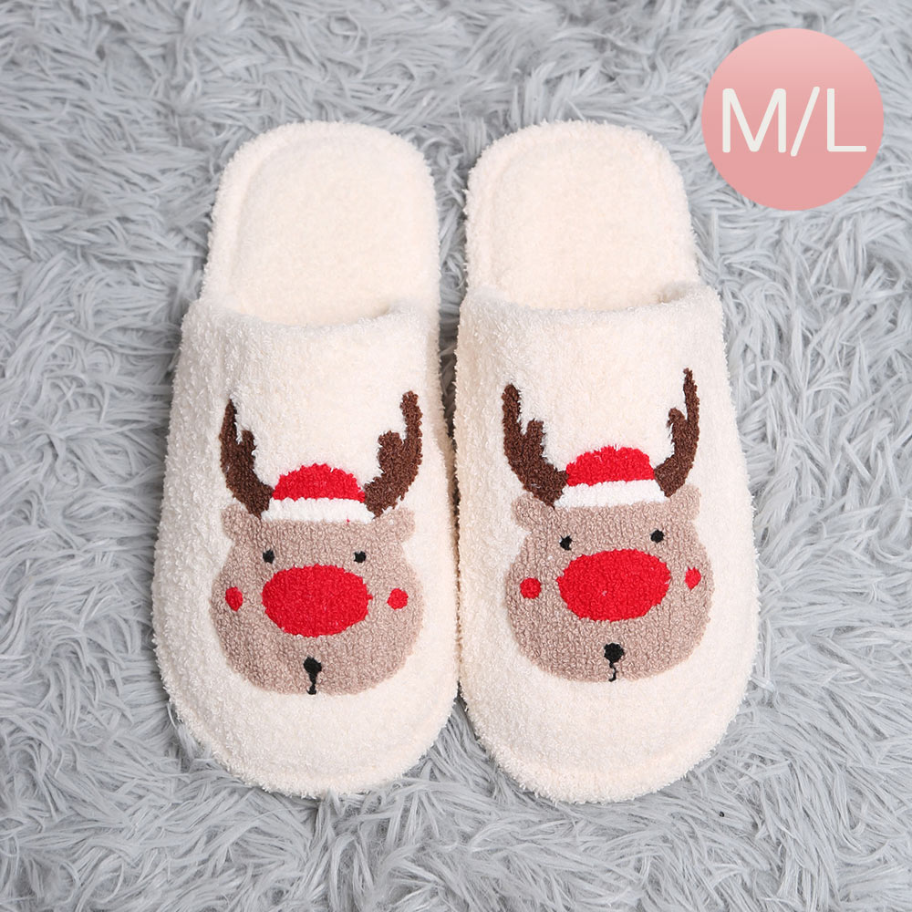 Details • Size : M/L (Women 8-10, Men 7-9) • Material : 100% Poly. Microfiber • Soft indoor slippers featuring a cute Rudolph design with antlers and a red nose. M/L size offers a comfortable fit for relaxing at home. A fun and festive holiday gift idea to keep feet warm and cheerful all season long.