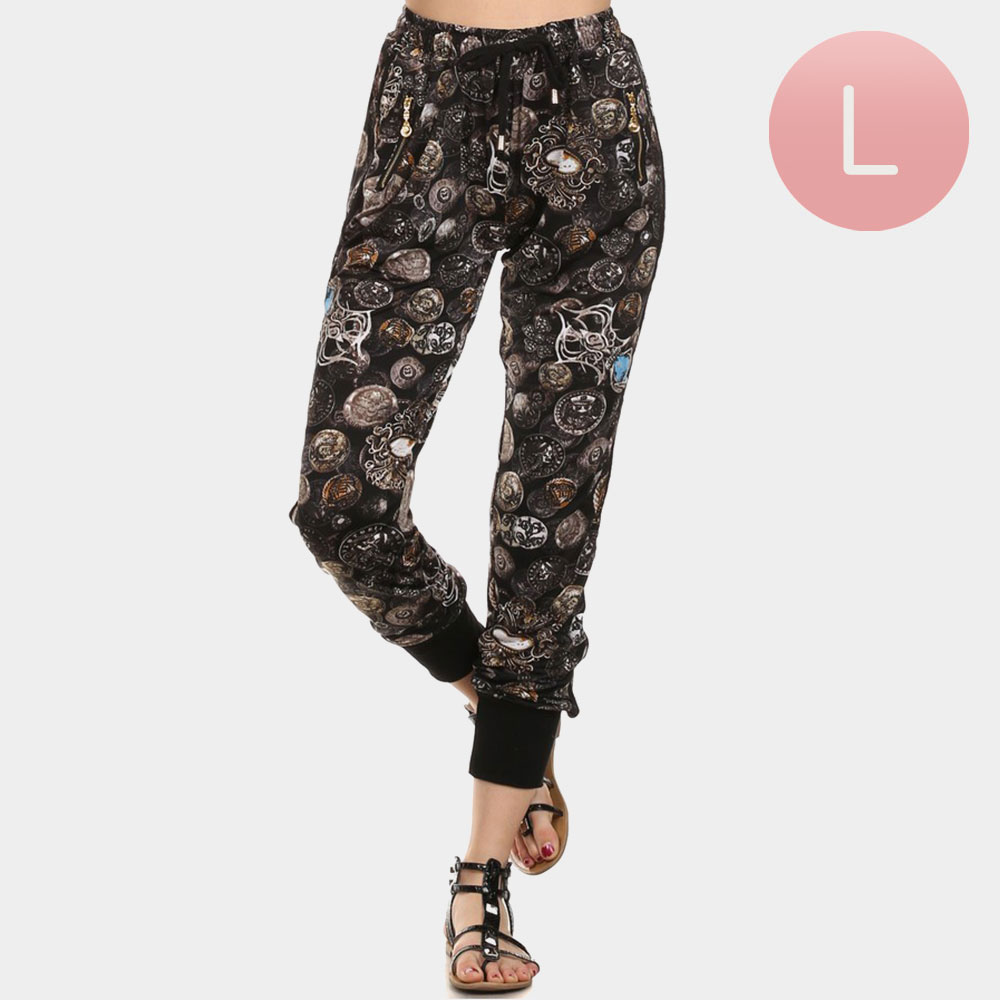 • Women's Joggers with cuffed ribbing at hem. Quarters print, jogger pants with drawstring and zipper embellishment.
