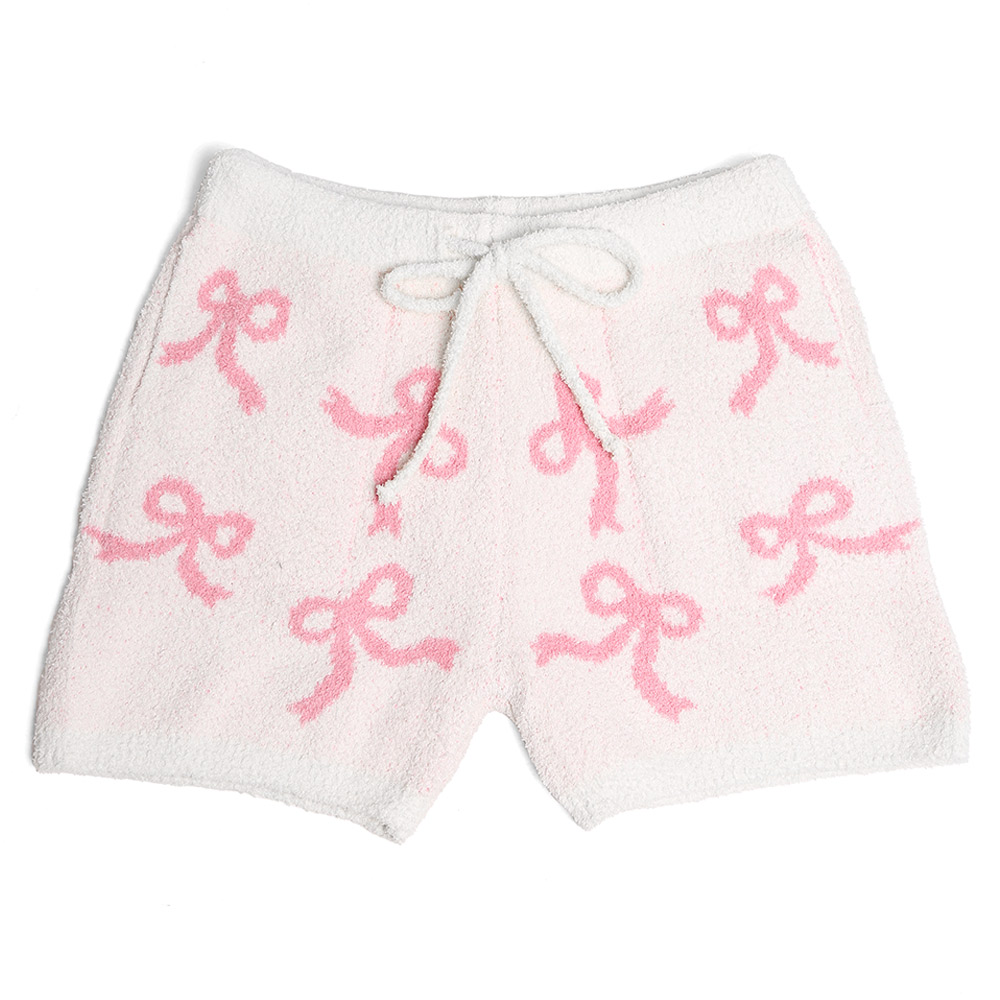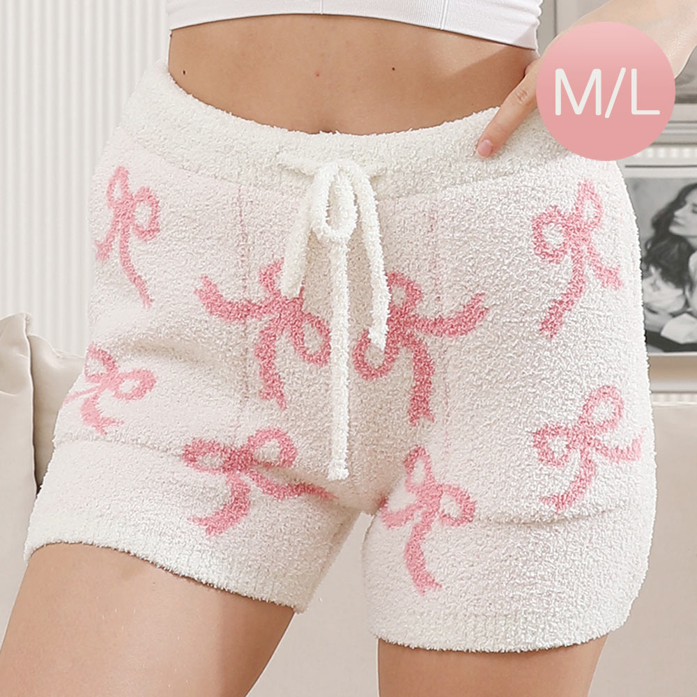 Details • Size : M/L • Material : 100% Poly.Microfiber • Stay cute and comfortable in these bow print loungewear shorts. Featuring an adjustable drawstring waist and cozy texture, these shorts are perfect for relaxing at home, casual lounging, or pairing with your favorite sleepwear. A charming blend of comfort and style for everyday wear.