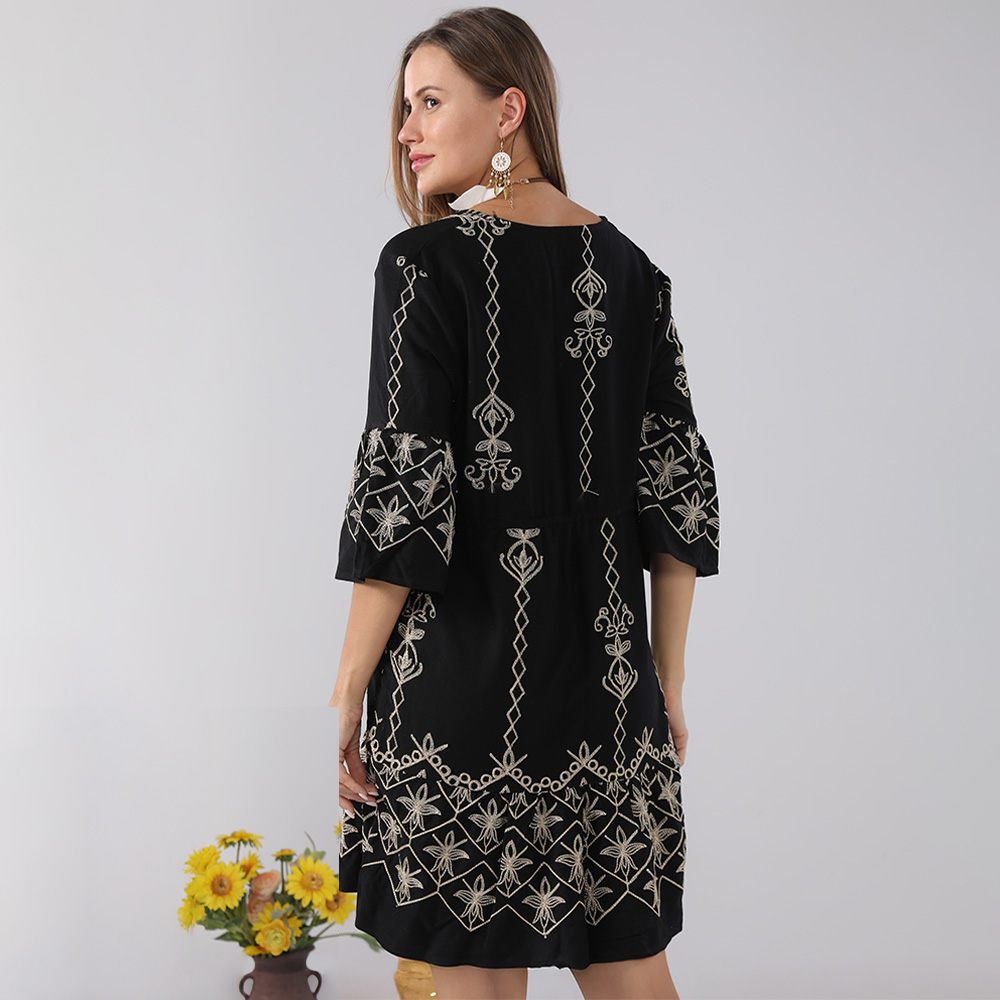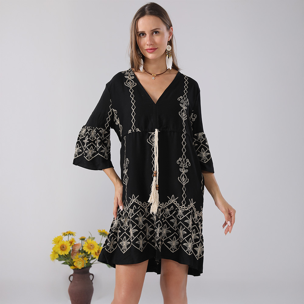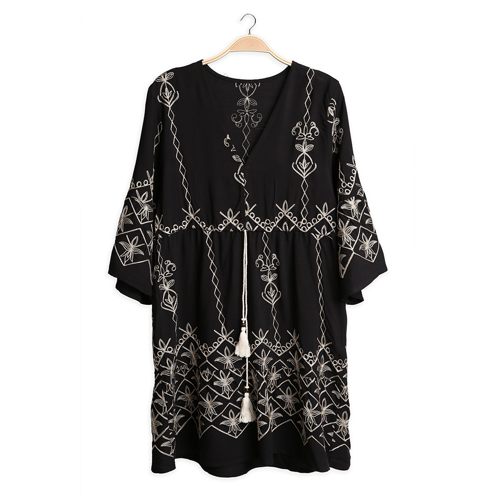 Details • Size : One Size • Material : 50% Cotton, 50% Viscose • Intricate embroidery detailing for a boho-chic vibe • Loose and flowy silhouette - perfect for all-day comfort • Dep V-neck with adjustable tassel ties • Bell sleeves add a touch of elegance and femininity • Ideal as a tunic dress, beach cover-up, or casual summer outfit