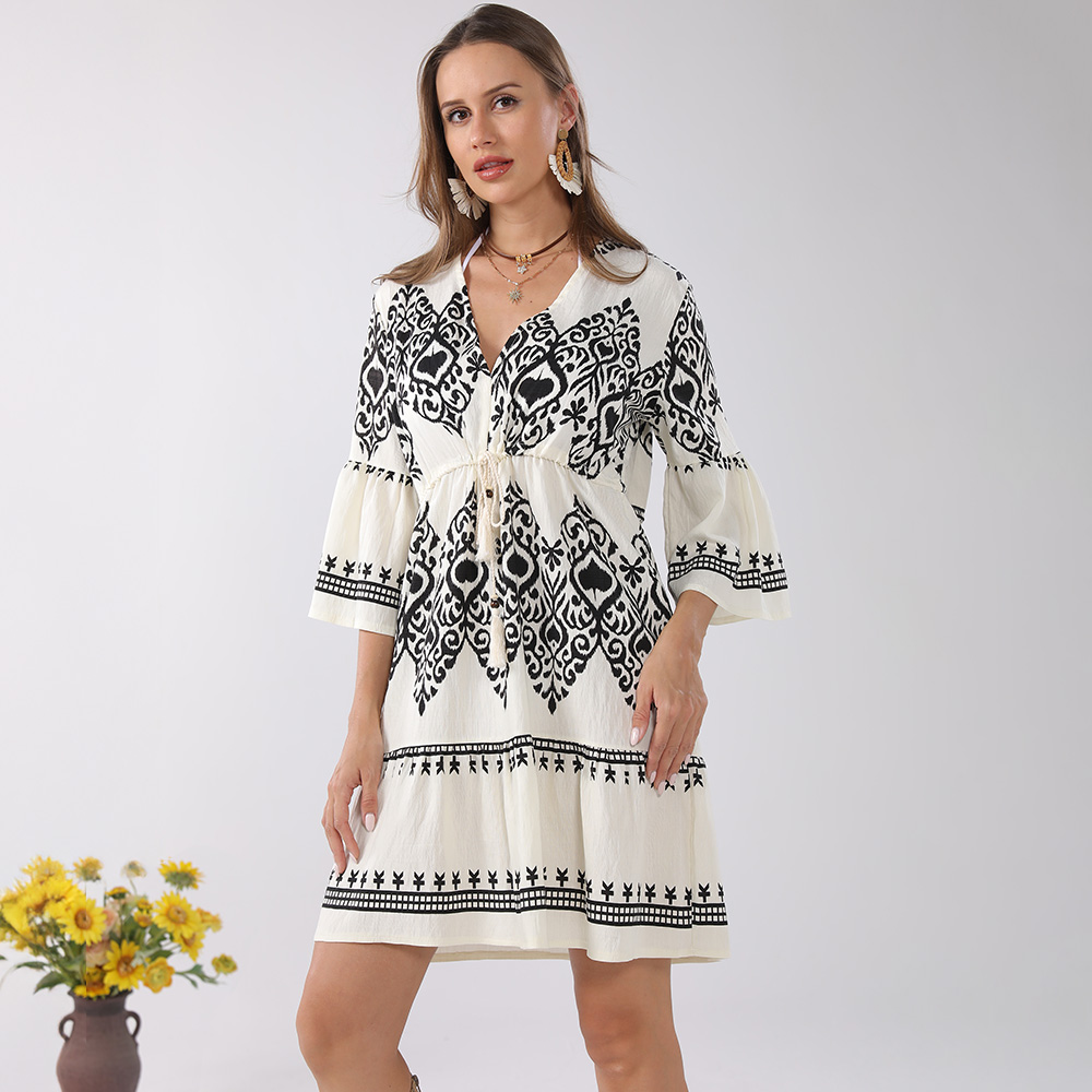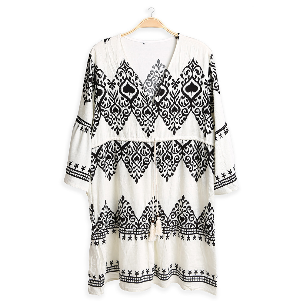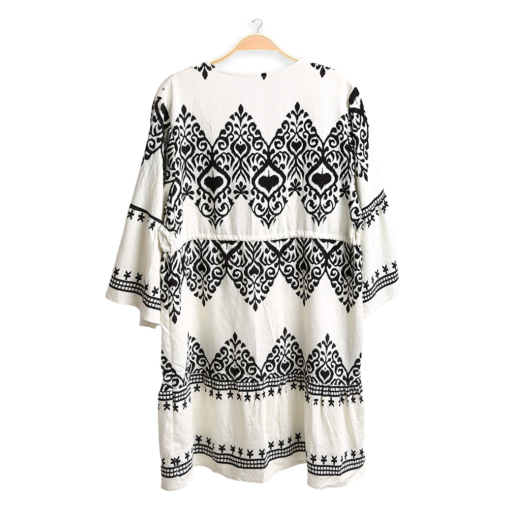 Details • Size : One Size • Material : 100% Viscose • Unique geometric tribal embroidery design • Relaxed and flowy fit - lightweight fabric ensures all-day comfort • Deep V-neck with tassel drawstring - adjustable for a flattering fit • 3/4 bell sleeves adds a touch of elegance and breathability • Wear as a boho dress, tunic top, or beach cover-up