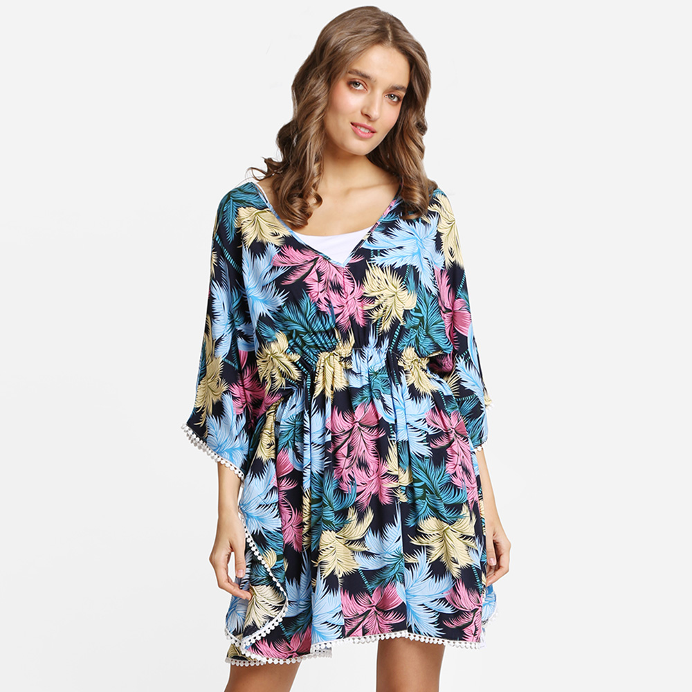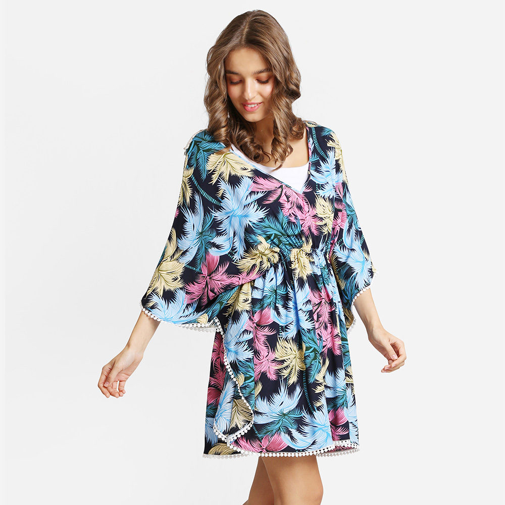 Details • Size : One Size • Material : 100% Viscose • Tropical palm print kaftan dress in navy with pastel pink, blue, and yellow tones. Features a cinched waist and pom-pom trim—crafted from breathable viscose for stylish summer comfort and beach-ready flair.