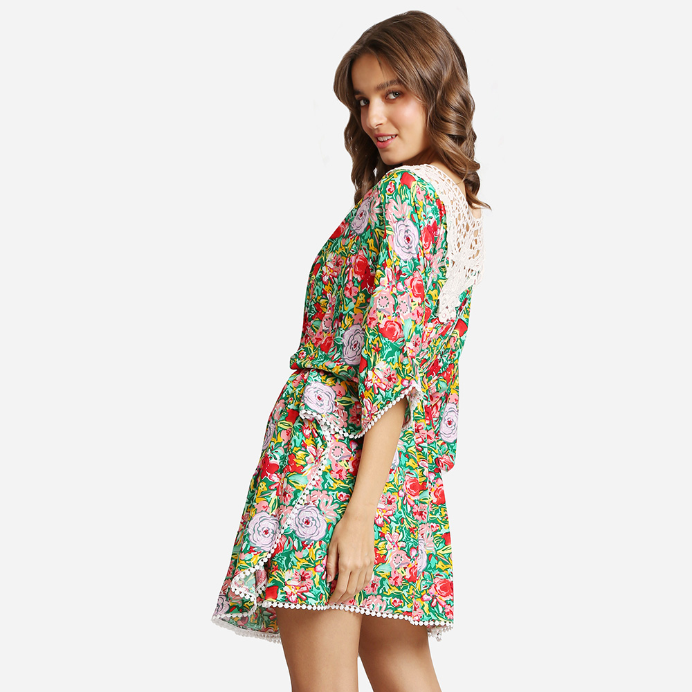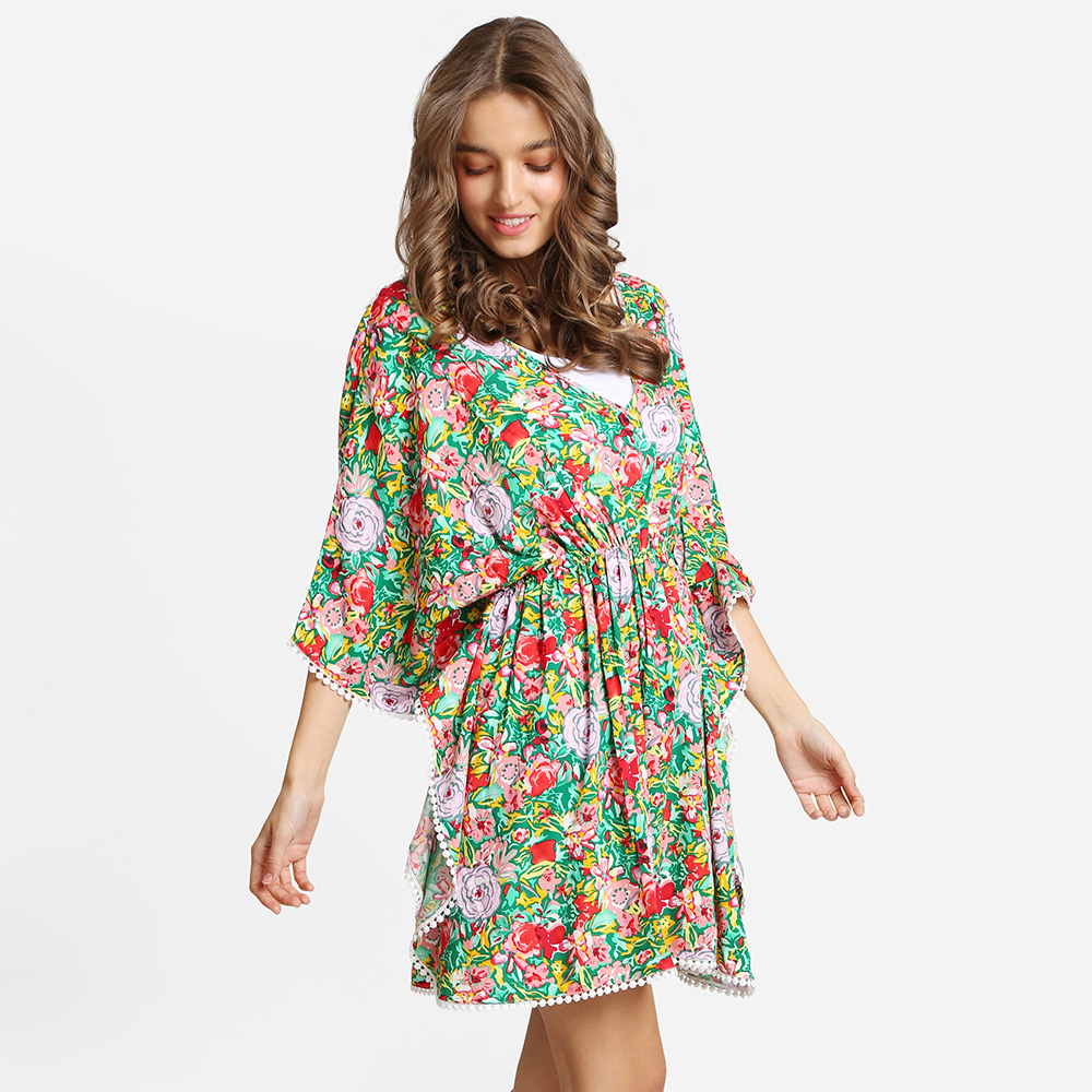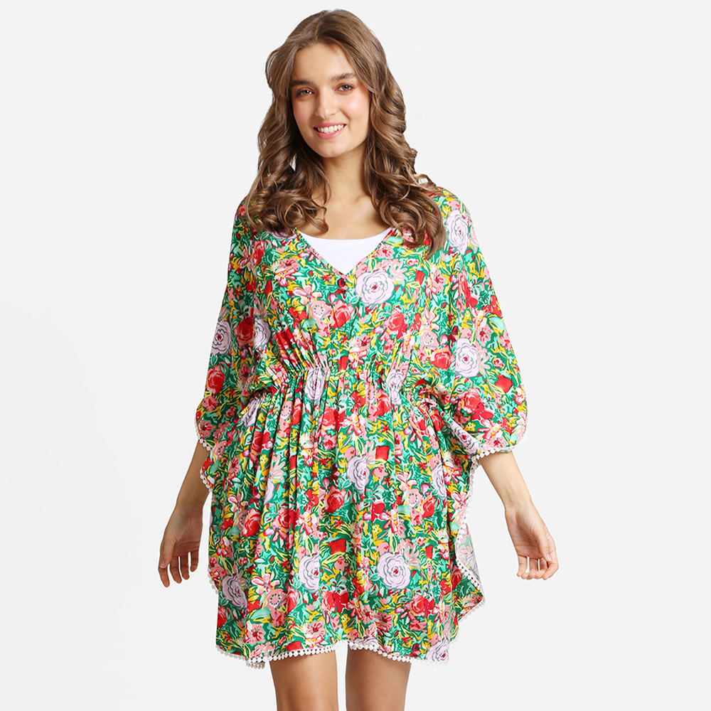 Details • Size : One Size • Material : 100% Viscose • Bold and colorful floral kaftan dress featuring a cinched waist, pom-pom trim, and vibrant green base with red and pink blooms. Made from lightweight viscose—ideal for beach days or sunny getaways.