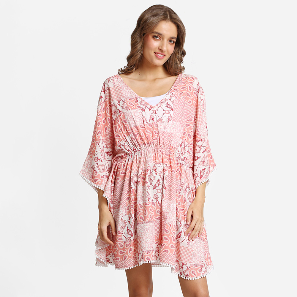 • Playful orange printed kaftan dress with cinched waist and white pom-pom trim. Made from soft, breathable viscose—perfect for beach cover-ups, summer festivals, or casual boho looks.