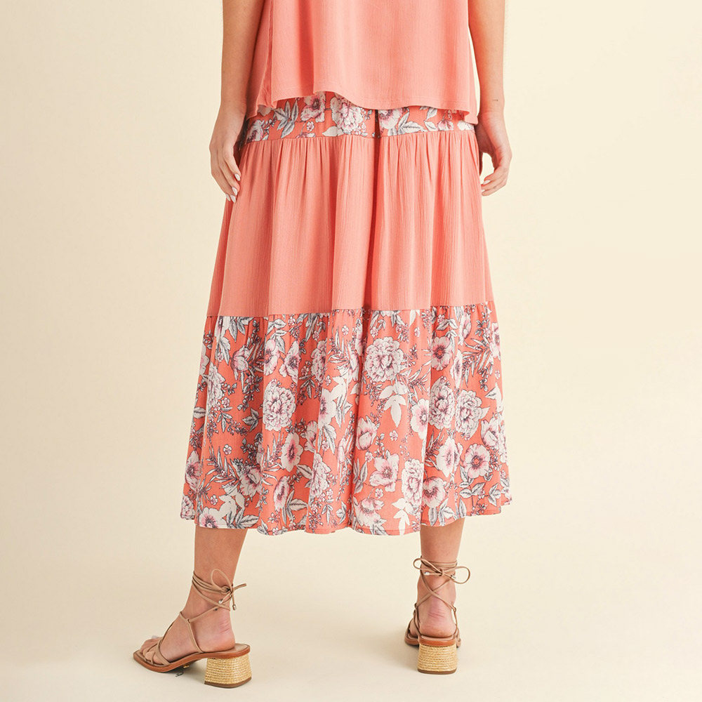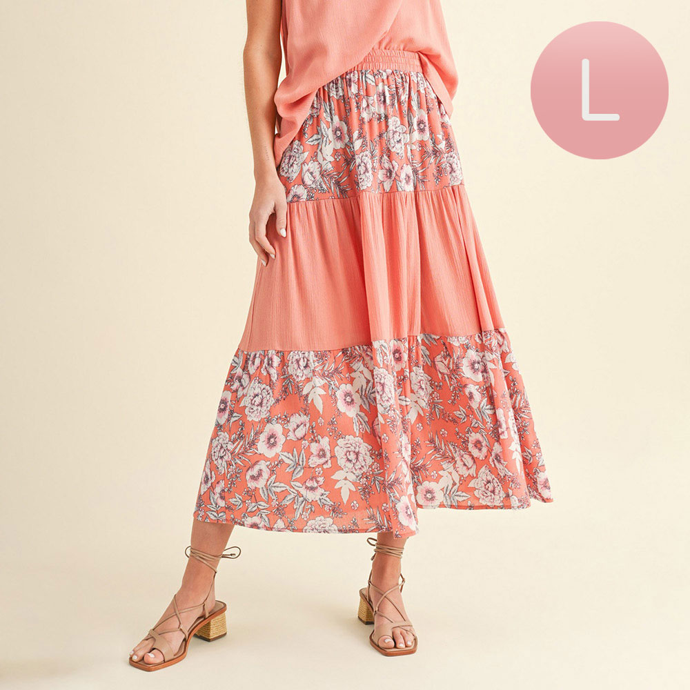Details • Size : Large • Introducing our Dream Floral skirt, a delightful addition to your wardrobe. Crafted with a gentle salmon hue and adorned with vibrant floral patterns, this skirt effortlessly embodies elegance and femininity. Its lightweight and flowy fabric ensure graceful movement with every step, while the elastic waistband offers comfort and versatility in fit. Perfect for Summer/ Spring! • Lightweight • Floral • Flowy • Touches at the waist • Elastic band • Ankle length • Imported • Material : 100% Rayon