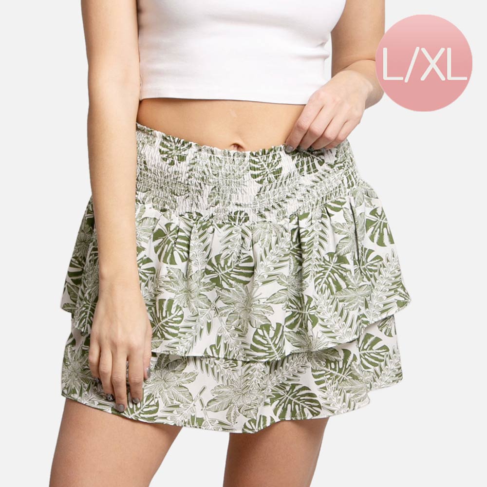 Tropical Leaf Patterned Ruffle Tiered Mini Skirt