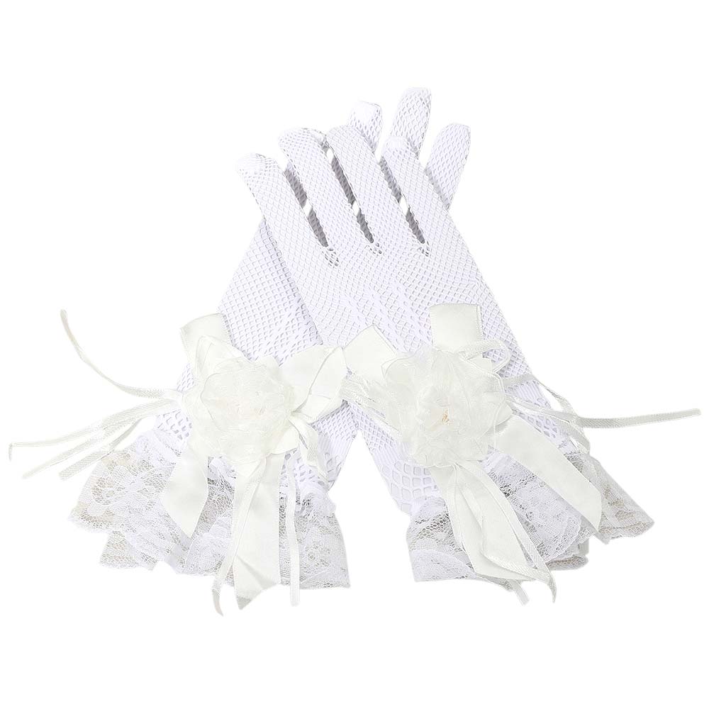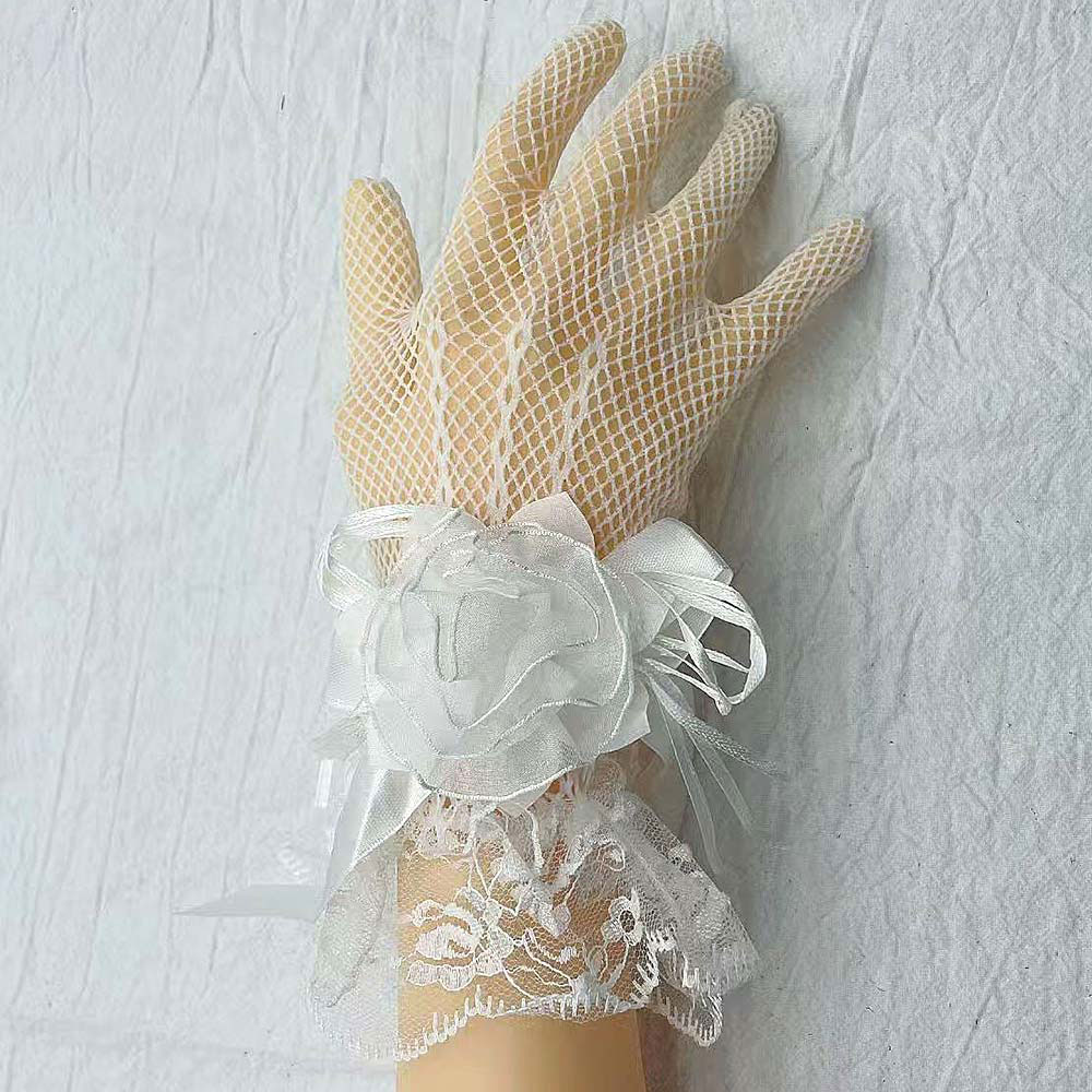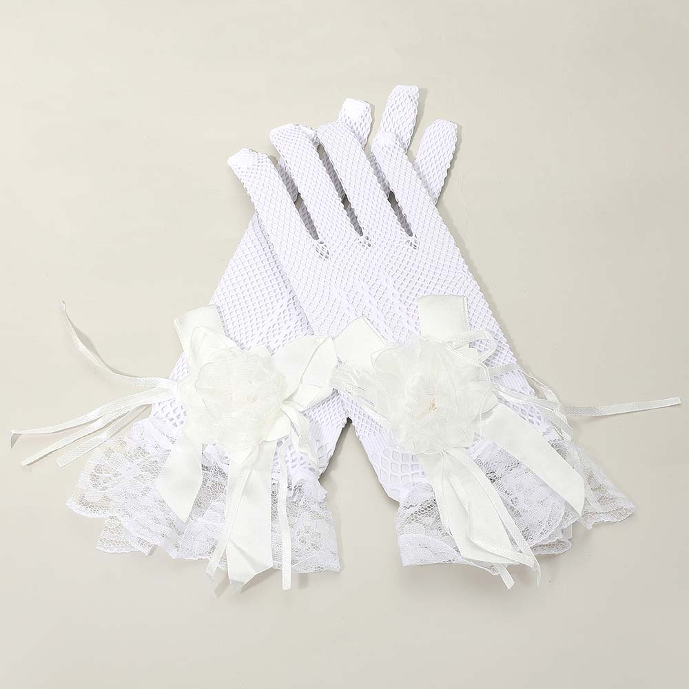 Details • Size : One Size (9" L) • Delicate mesh gloves featuring a lace cuff and a decorative floral wrist accent. Perfect for weddings, vintage themes, or costume wear. Adds a graceful and romantic touch to formal or bridal outfits.