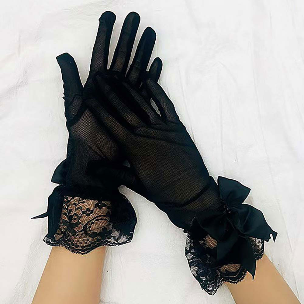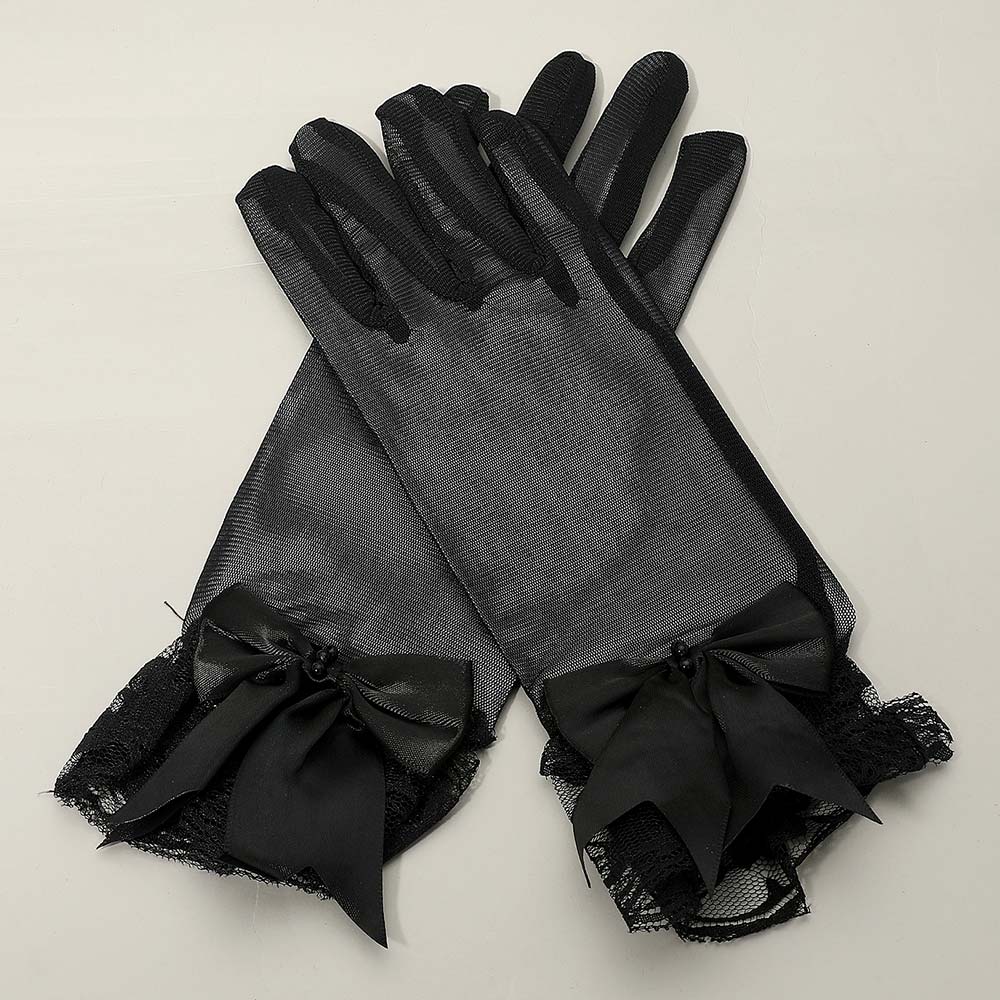 • Chic sheer gloves with lace cuffs and a satin-style bow, perfect for formal occasions, weddings, or costumes. Lightweight and elegant, they offer a refined touch to elevate any ensemble with charm and grace.