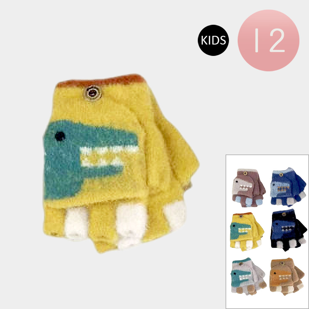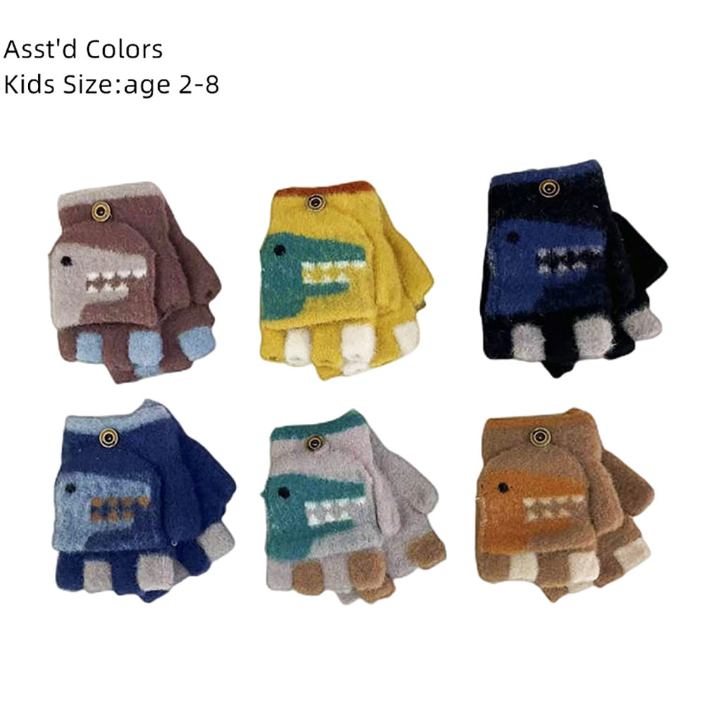 Details • Size : One Size • Material : 100% Acrylic • Playful kids fingerless gloves featuring a dinosaur design and flip top mitten cover for extra warmth. Great for school, outdoor adventures, or cold days. Soft, cozy, and easy to wear. Available in assorted fun styles perfect for little dinosaur fans.