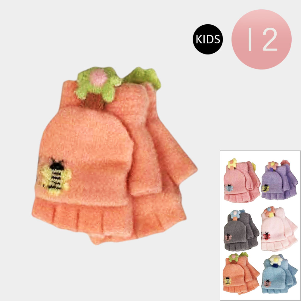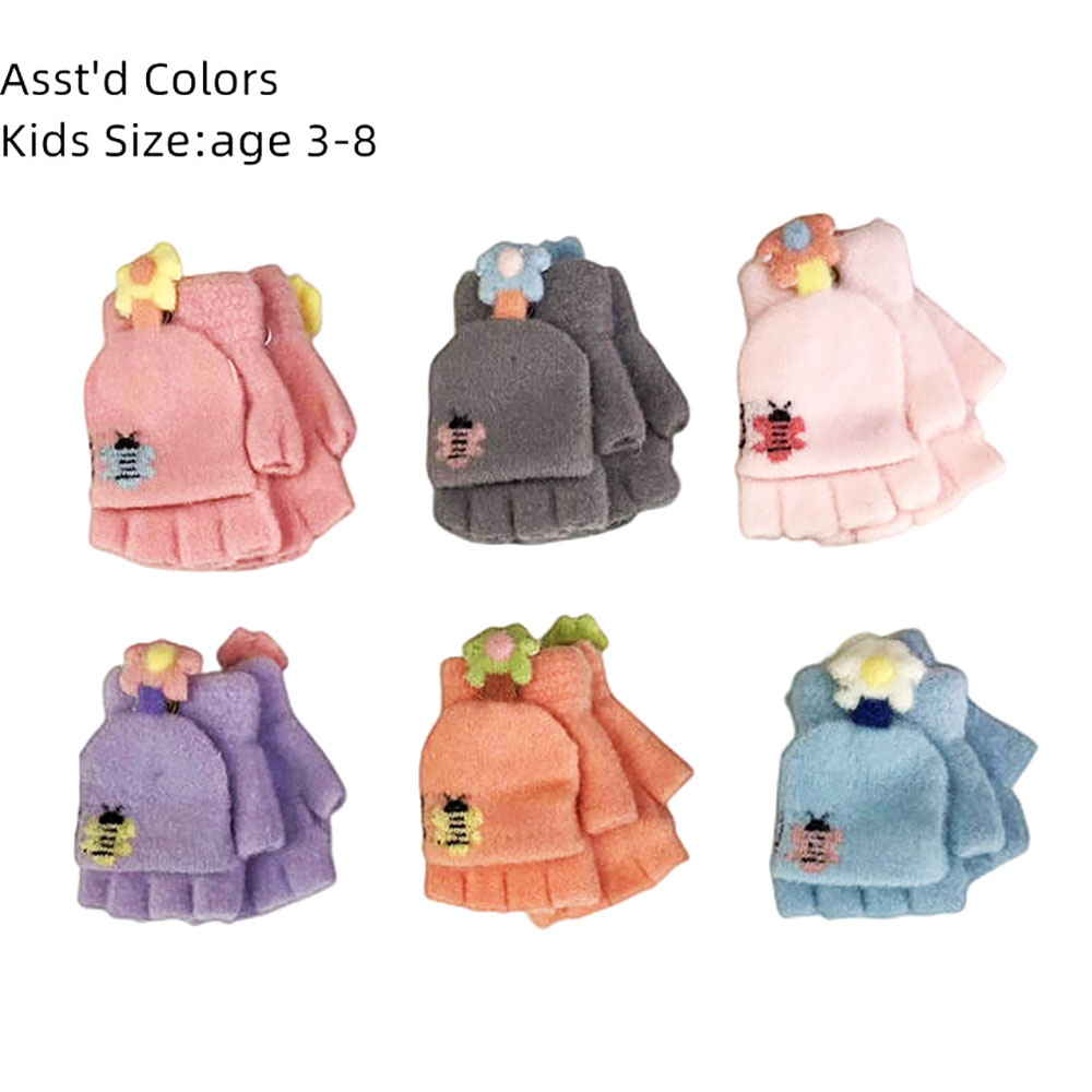 Details • Size : One Size • Material : 100% Acrylic • Soft kids fingerless gloves with a flip top mitten cover, featuring a cute bee and flower design. Keeps little hands warm while allowing finger movement. Perfect for school, play, or outdoor adventures. Available in assorted playful styles children will enjoy.