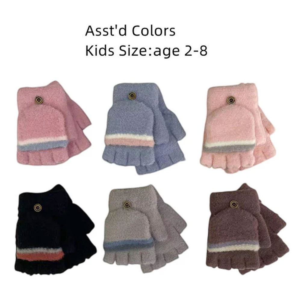 Details • Size : One Size • Material : 100% Acrylic • Comfortable kids fingerless gloves featuring a simple stripe detail and a fold-over mitten flap for added warmth. Great for school, outdoor fun, or everyday winter wear. Soft and cozy design available in assorted classic styles children will love.