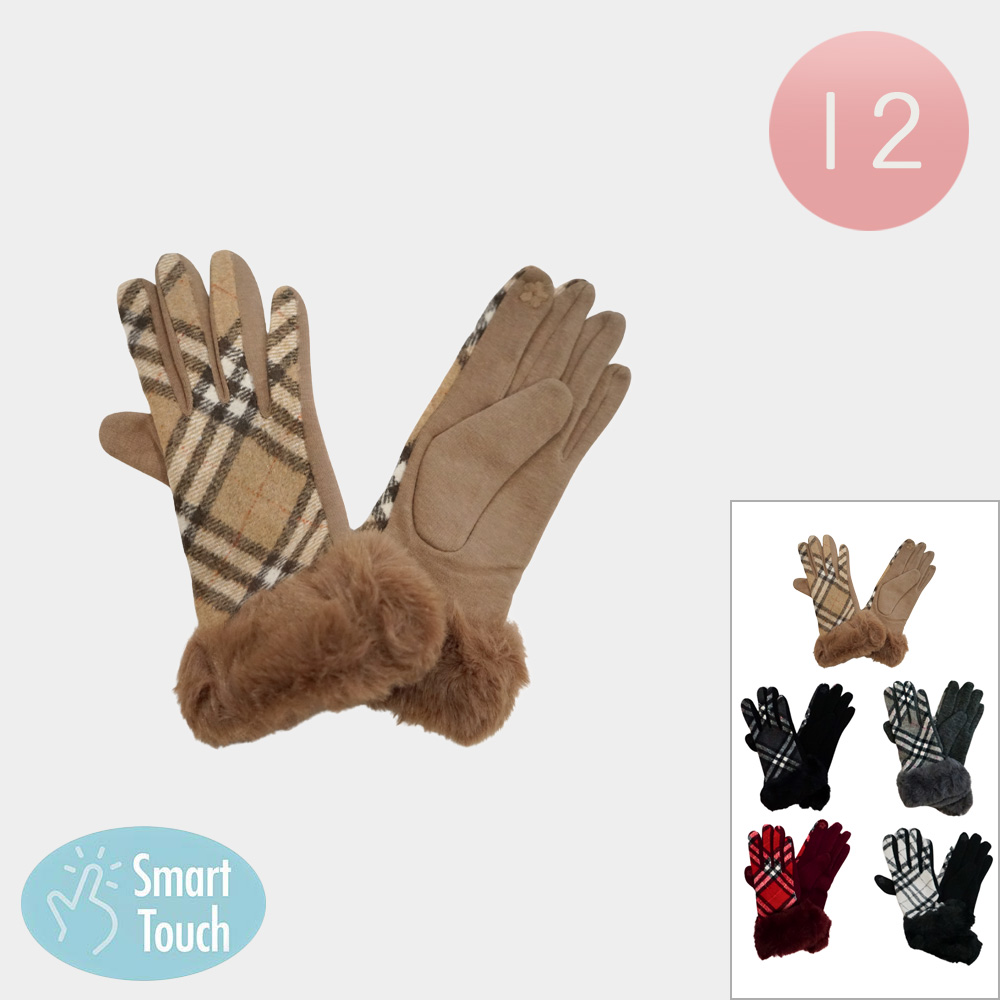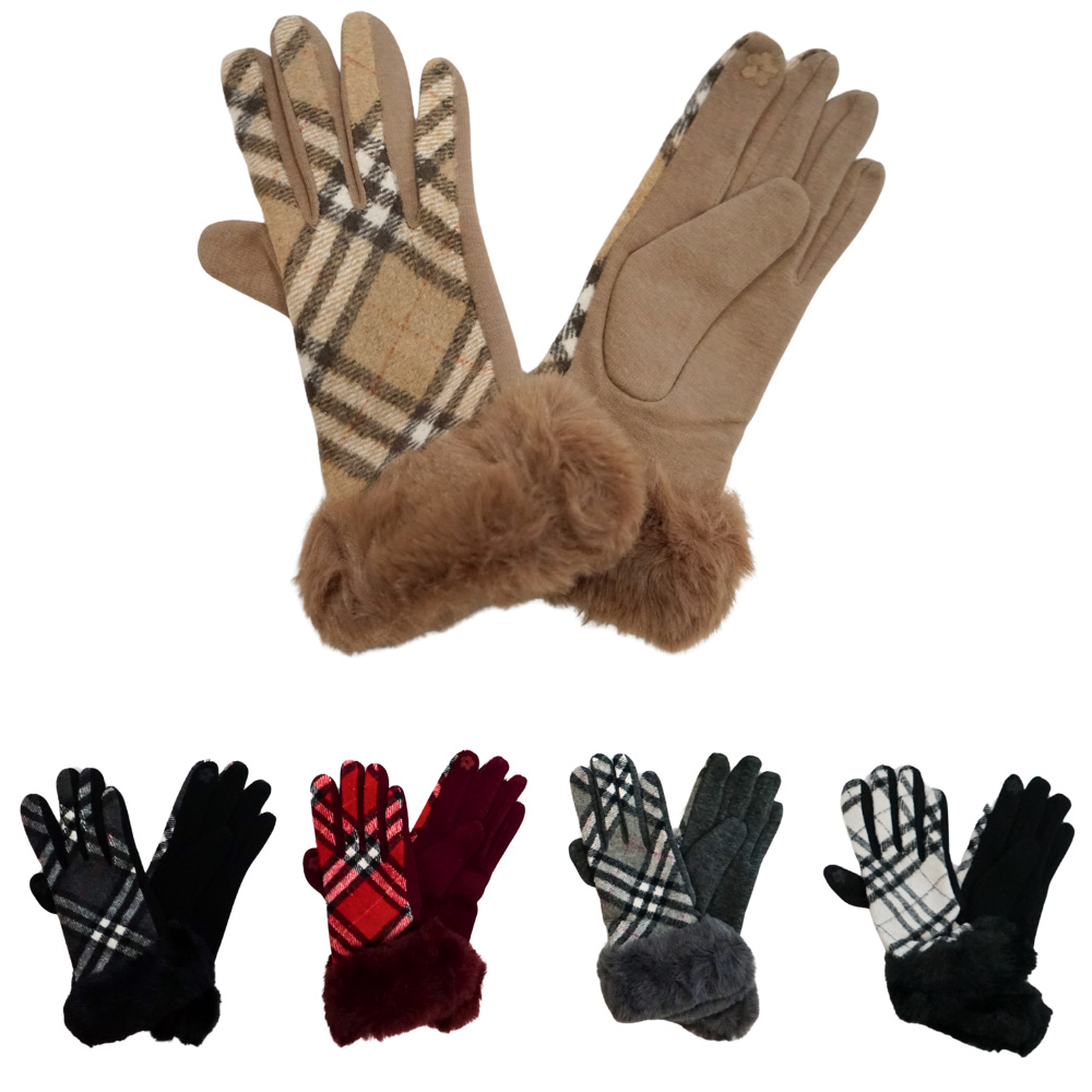 Details • Size : One Size • Material : 60% Cotton, 40% Polyester • 4Pairs TAUPE / 2Pairs BLACK / 2Pairs GRAY / 2Pairs RED / 2Pairs WHITE • Stay cozy and stylish with plaid smart touch gloves featuring soft faux fur cuffs. Designed for warmth and touchscreen convenience, these gloves combine fashion with function, perfect for driving, commuting, or cold-weather outings while adding a chic plaid accent to your winter wardrobe.