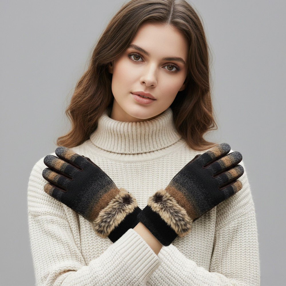 Details • Size : One Size • Material : 65% Polyester, 35% Cotton • 5Pairs BLACK / 3Pairs BROWN / 2Pairs PINK / 2Pairs NAVY • Stay warm and stylish with these striped smart touch gloves featuring soft faux fur cuffs and touchscreen fingertips. Perfect for everyday winter wear, they combine function with fashion. Sold in assorted colors and patterns in a 12-pack, making them a cozy and practical choice for personal use or gifting.