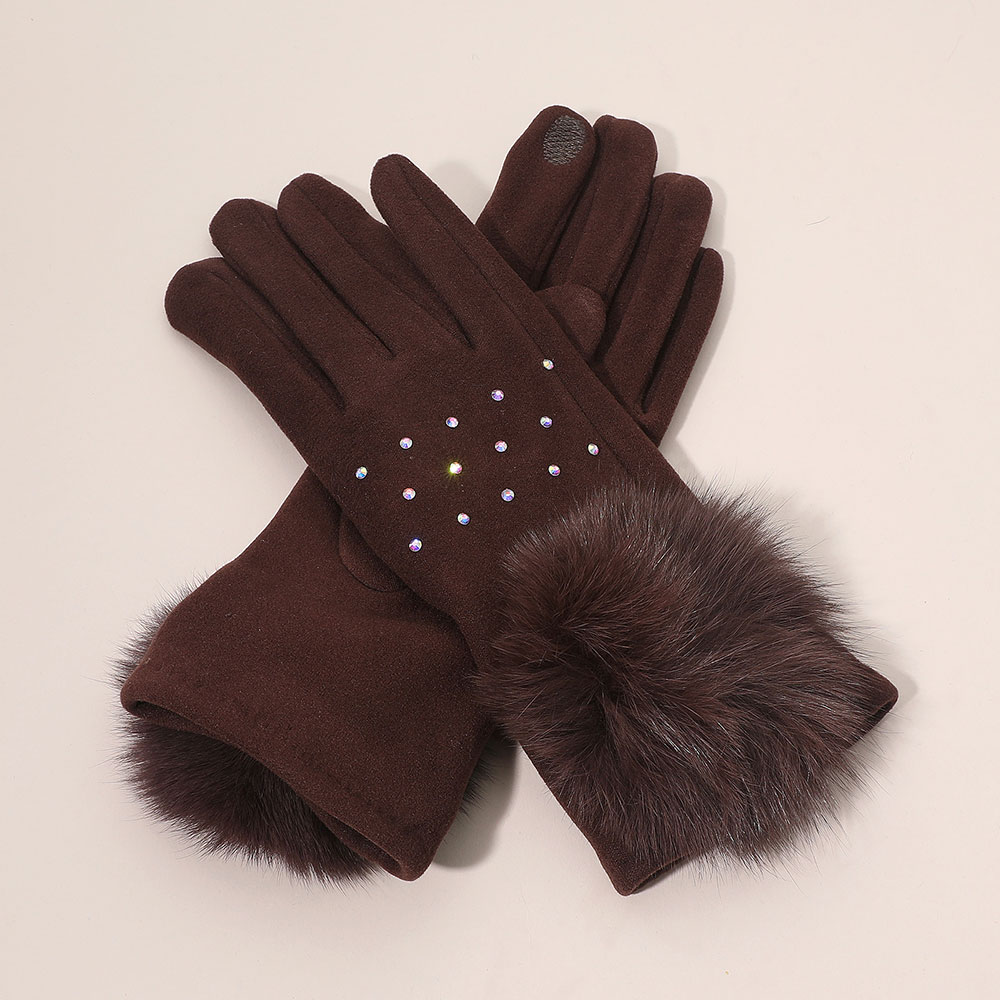 • Elegant smart touch gloves featuring faux fur cuff poms and sparkling rhinestone accents. Designed for warmth and convenience, these chic gloves allow touchscreen use while adding a touch of sophistication to any outfit, perfect for stylish cold-weather wear and everyday elegance.