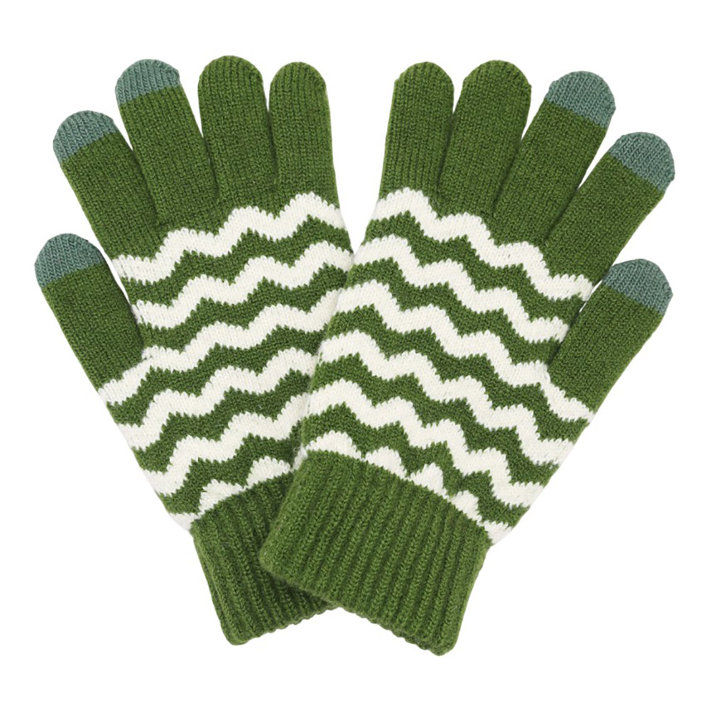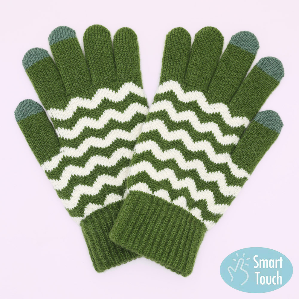Details • Size : One Size • Material : 70% Polyester, 30% Wool • Smart Touch • Cozy knit touchscreen gloves with a bold wave pattern, perfect for winter days. Enjoy full mobile device use while keeping your hands warm and stylish with these functional and comfortable gloves.