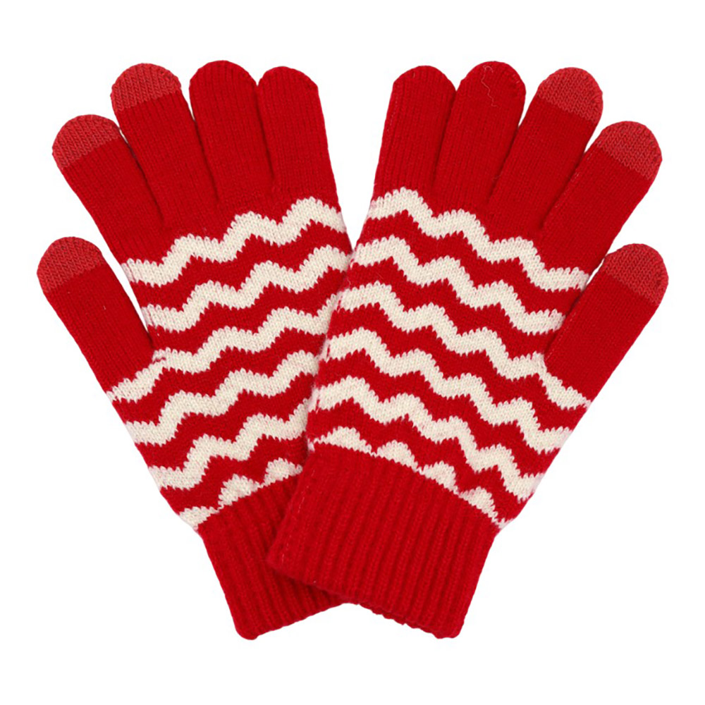 Details • Size : One Size • Material : 70% Polyester, 30% Wool • Smart Touch • Cozy knit touchscreen gloves with a bold wave pattern, perfect for winter days. Enjoy full mobile device use while keeping your hands warm and stylish with these functional and comfortable gloves.