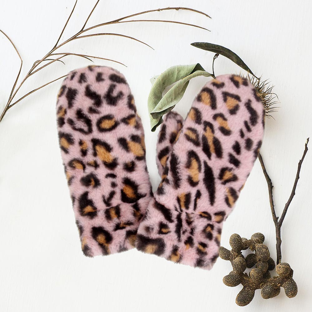 Leopard Patterned Faux Fur Lining Mitten Gloves