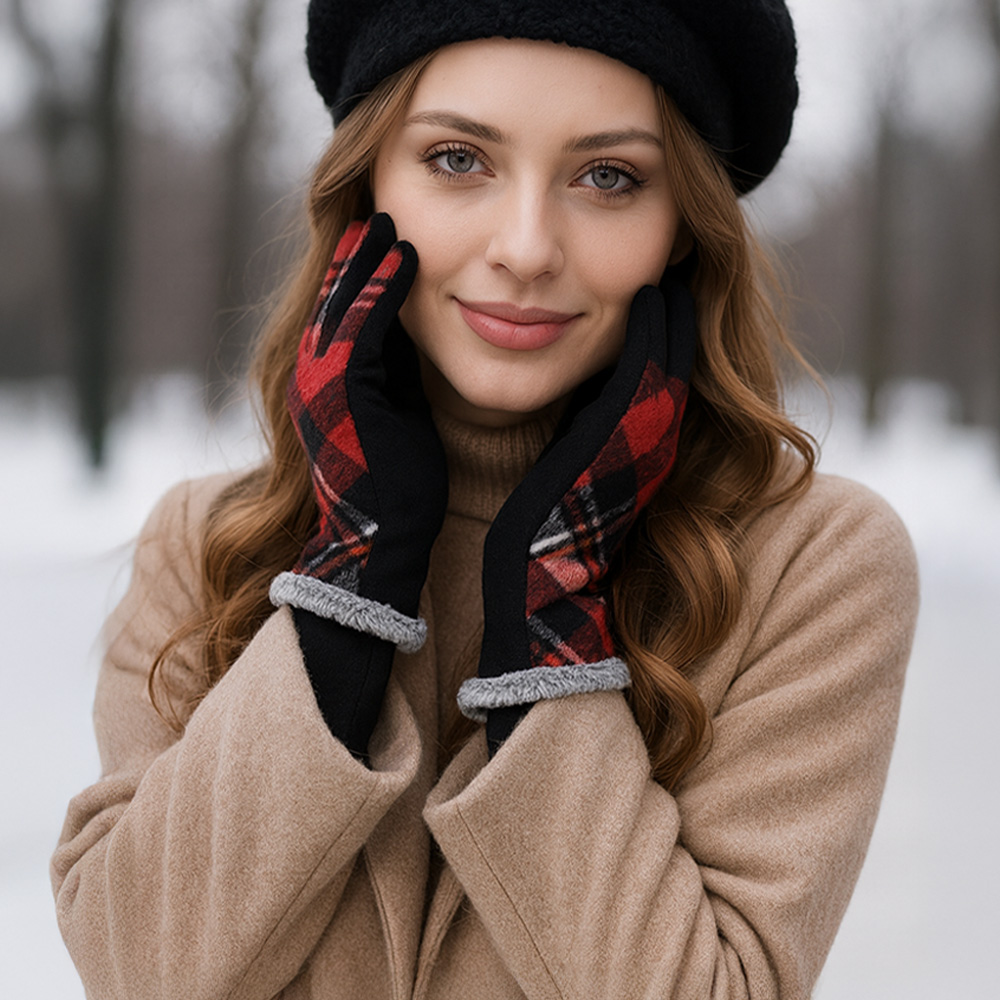 Details • Size : One Size • Material : 100% Polyester • Smart Touch • Stylish plaid gloves designed with smart touch technology for easy phone use. A cozy winter accessory combining warmth, comfort, and practicality, perfect for keeping hands protected while staying connected outdoors or on the go.