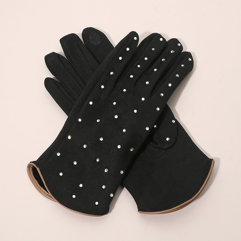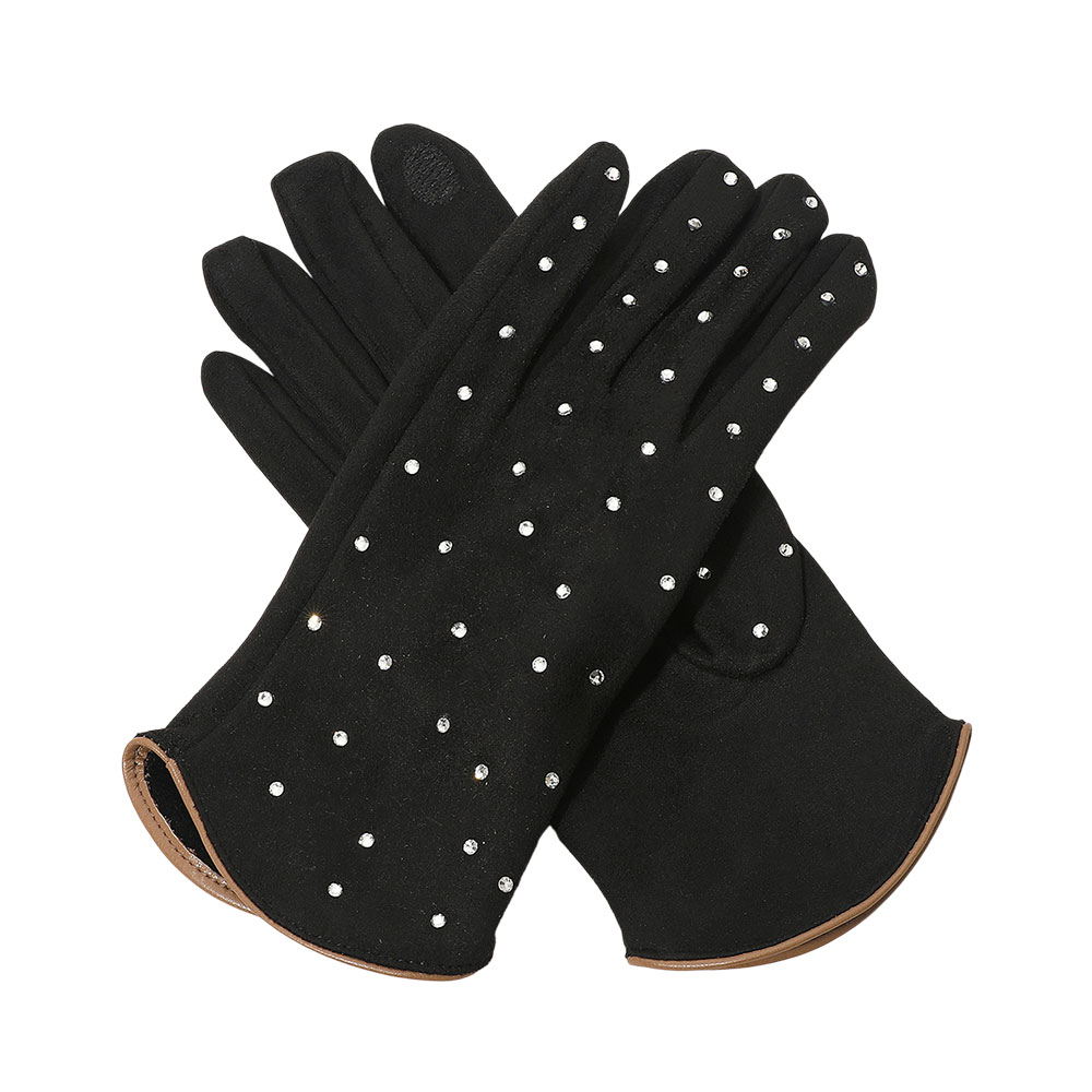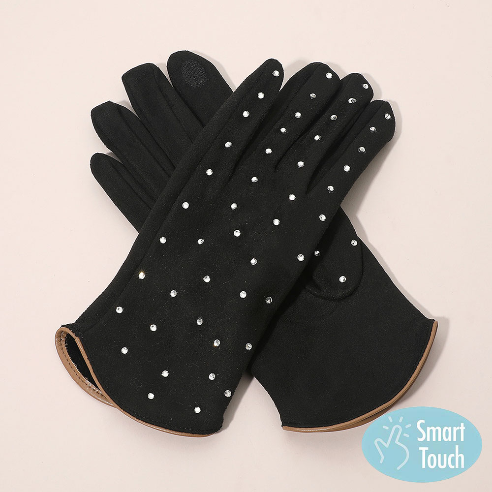 Details • Size : One Size (9" L) • Material : 100% Polyester • Smart Touch • Elegant smart touch gloves adorned with sparkling rhinestones and a sleek trim finish. These stylish gloves combine comfort with functionality, allowing touchscreen use while keeping hands warm and chic — perfect for both casual outings and sophisticated cold-weather looks.