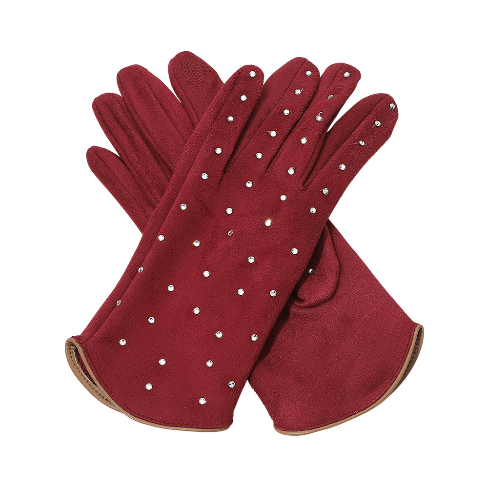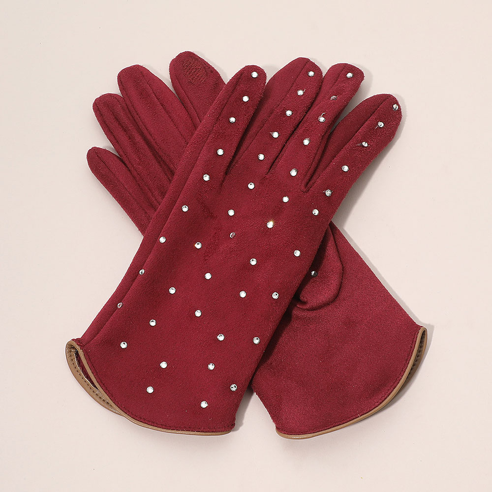Details • Size : One Size (9" L) • Material : 100% Polyester • Smart Touch • Elegant smart touch gloves adorned with sparkling rhinestones and a sleek trim finish. These stylish gloves combine comfort with functionality, allowing touchscreen use while keeping hands warm and chic — perfect for both casual outings and sophisticated cold-weather looks.
