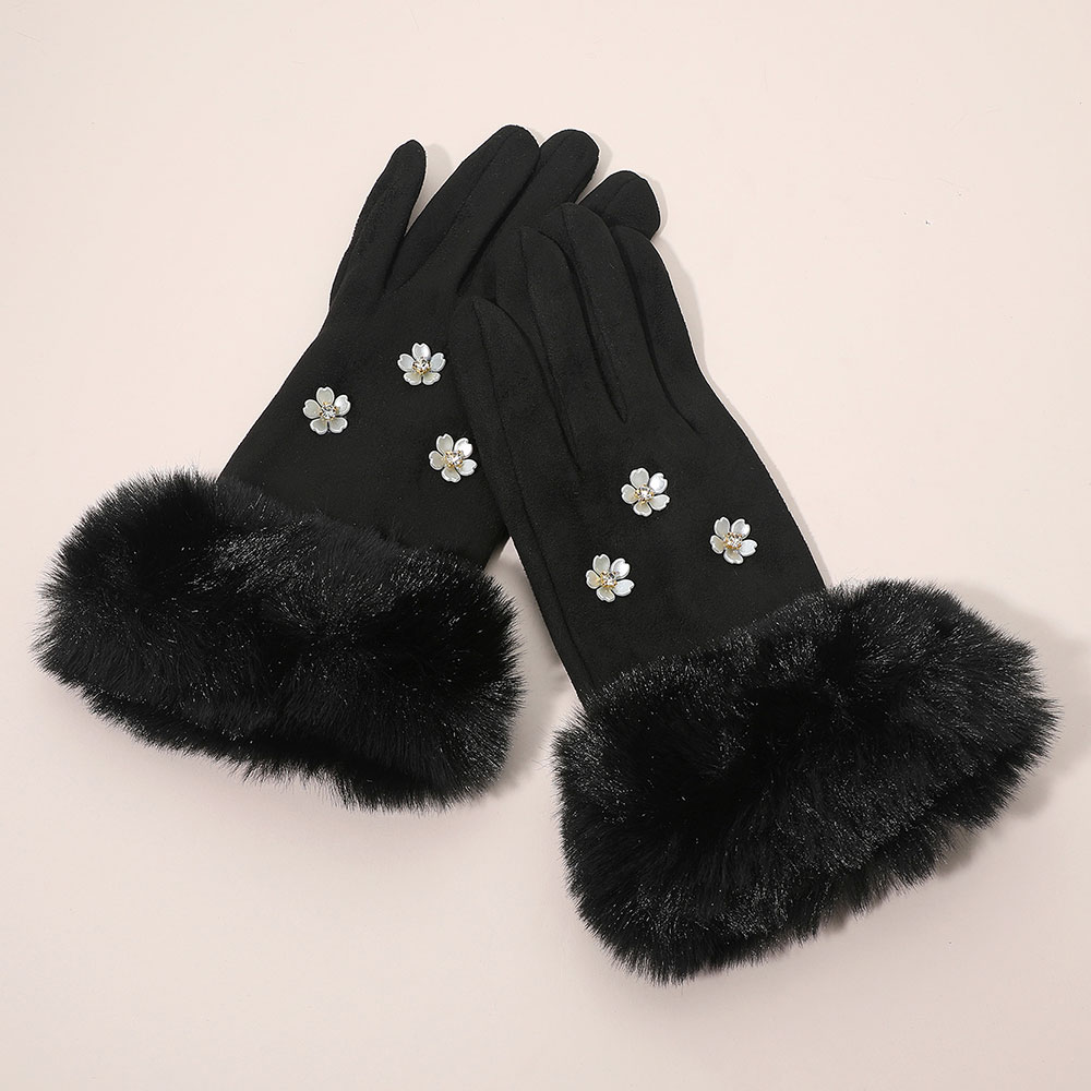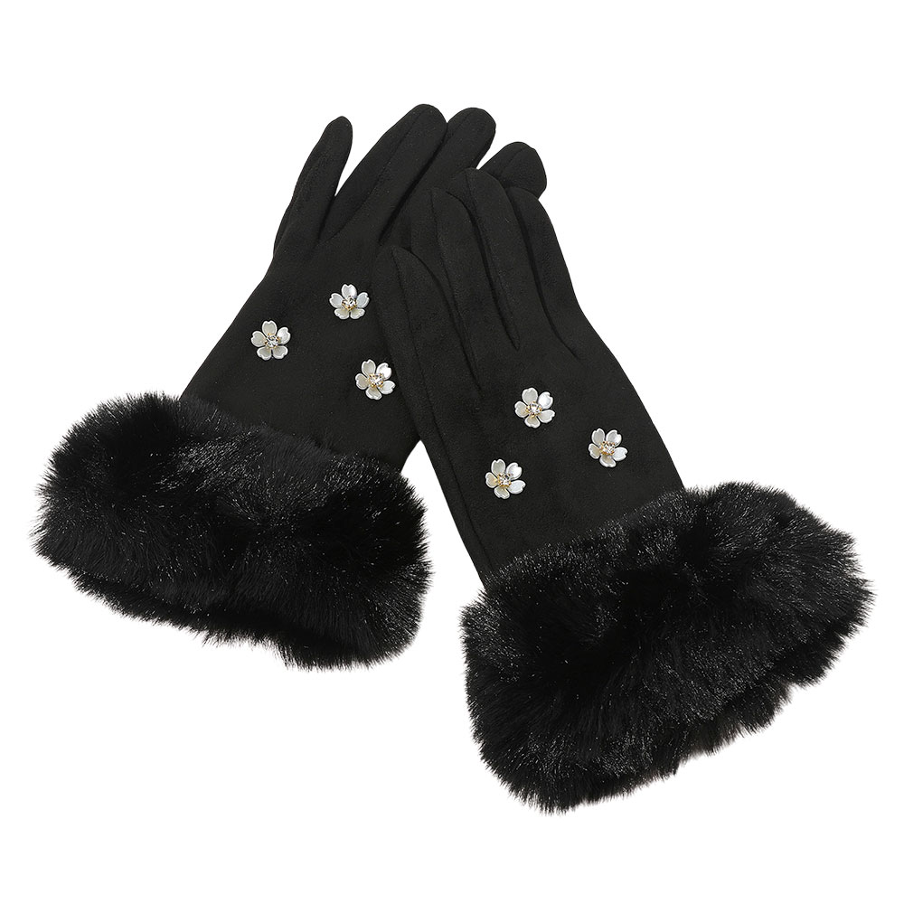 Details • Size : One Size (10" L) • Material : 100% Polyester • Smart Touch • Elegant smart touch gloves featuring faux fur cuffs and delicate floral embellishments for a chic, feminine touch. Designed for comfort and style, these gloves keep hands warm while allowing easy touchscreen use, perfect for everyday wear or adding flair to winter outfits.