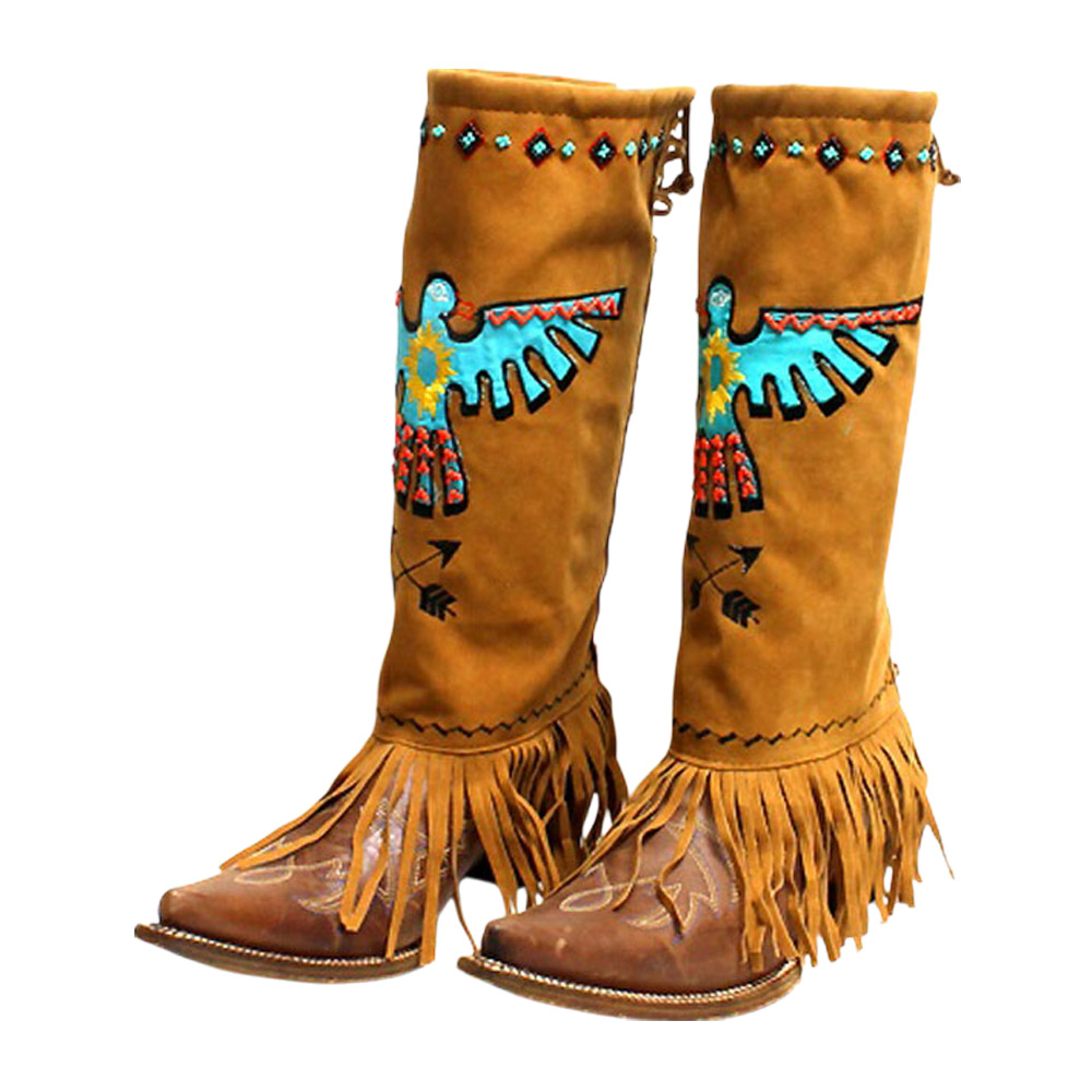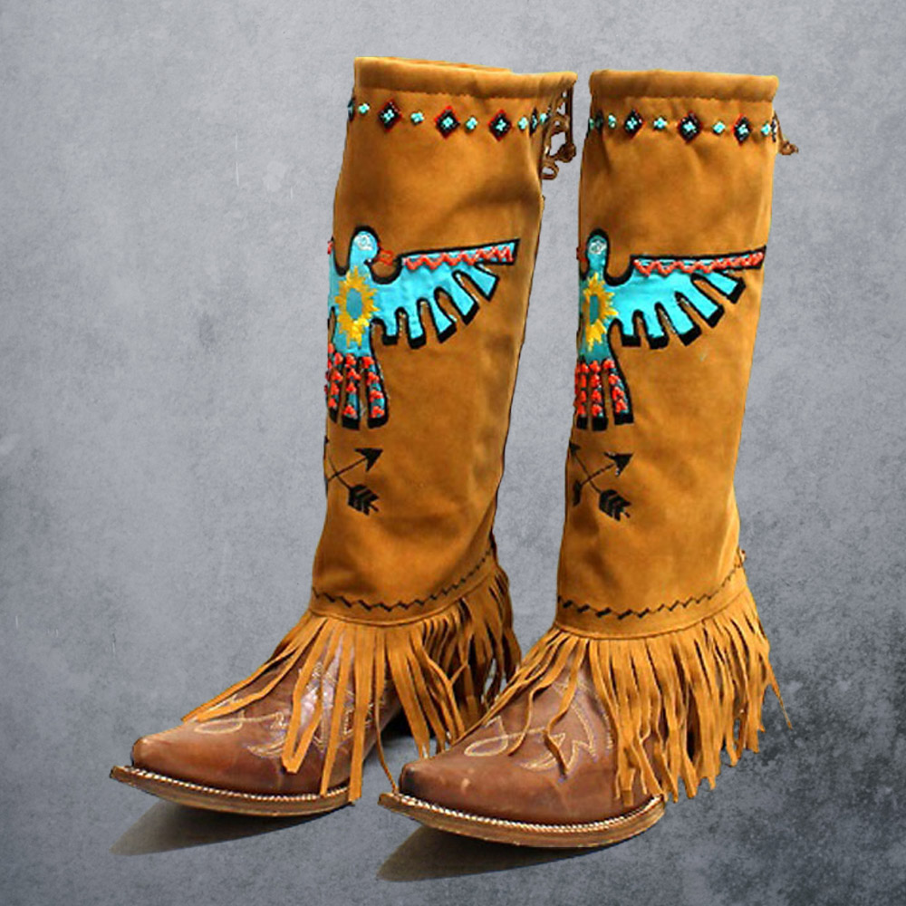 Details • Size : 6" X 16" • Adjustable • Material : Polyester / Faux Suede • Step into bold western flair with these tall cowboy boots featuring detailed thunderbird embroidery and fringe accents. Perfect for festivals, rodeos, or standout everyday wear, these boots offer a unique blend of tradition and modern edge.