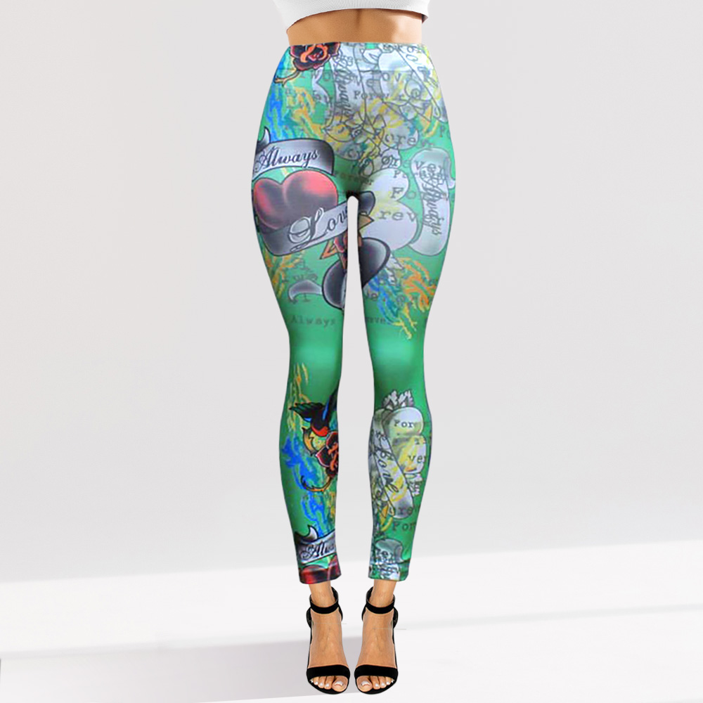 • High-waisted leggings featuring a bold, tattoo-inspired graphic design. Combines edgy style with comfortable stretch fit, perfect for workouts or streetwear fashion. A standout piece for expressive, casual looks.