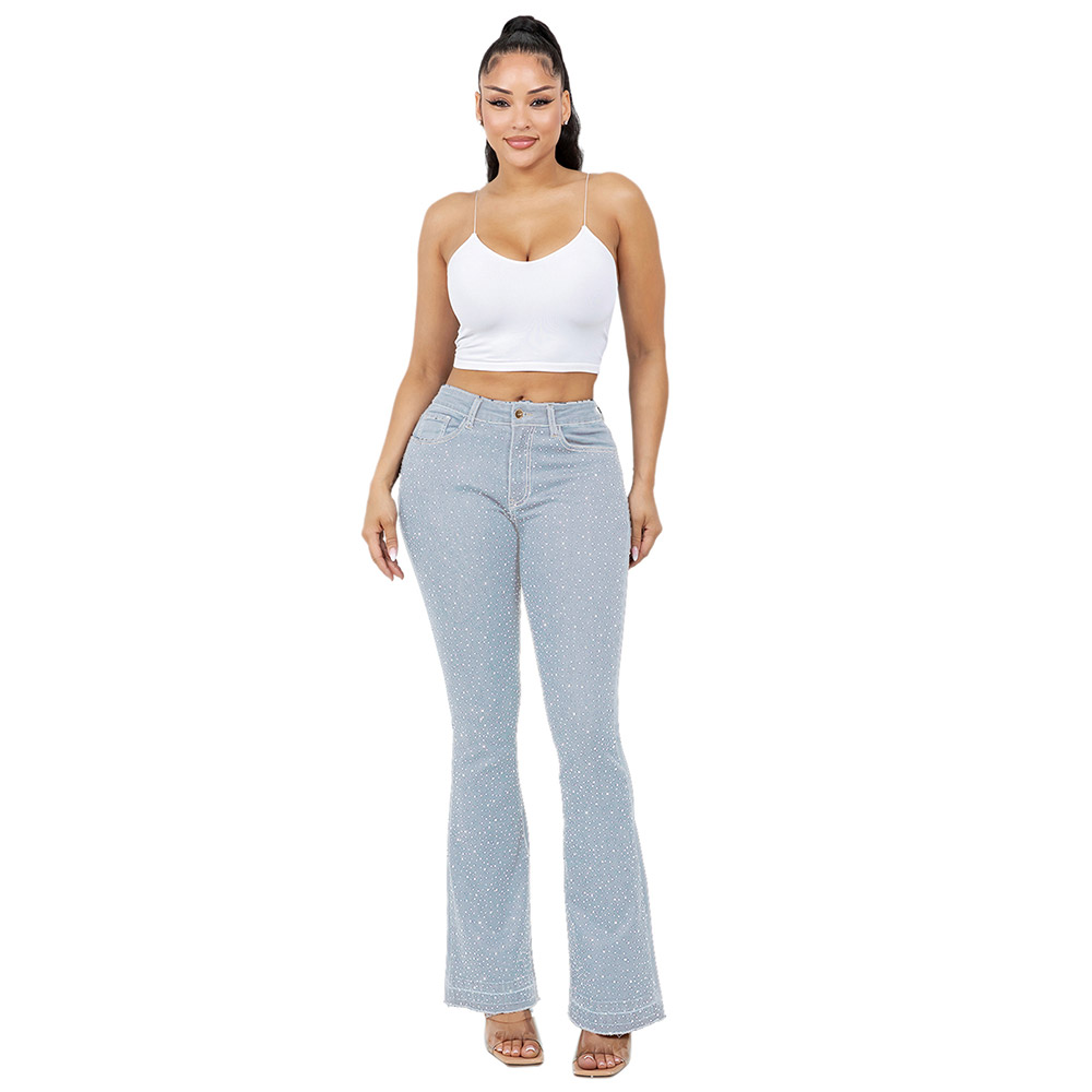 Details • Size : 4XL • Material : 67% Cotton, 20% Polyester, 11% Rayon, 2% Spandex • Hand Wash in Warm Water • Do not bleach / hang dry • Elevate your wardrobe with plus size bootcut jeans featuring a flattering high-rise fit and sparkling stud embellishments. Stretchy fabric offers comfort and style perfect for casual or dressy looks.