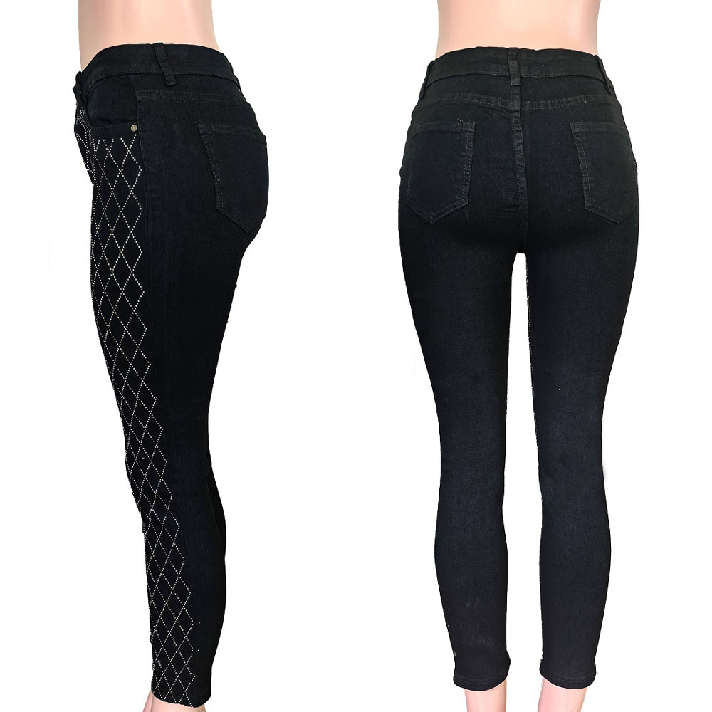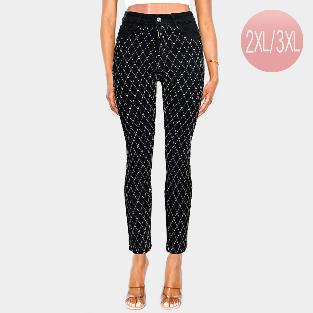 Details • Size : 2XL/3XL • Material : 67% Cotton, 20% Polyester, 11% Rayon, 2% Spandex • Hand Wash in Warm Water • Do not bleach / hang dry • Trendy high waist jeans featuring a sleek slim fit and an all-over diamond pattern stitch detail. Designed for both comfort and style, these pants elevate casual looks with a modern, flattering silhouette.