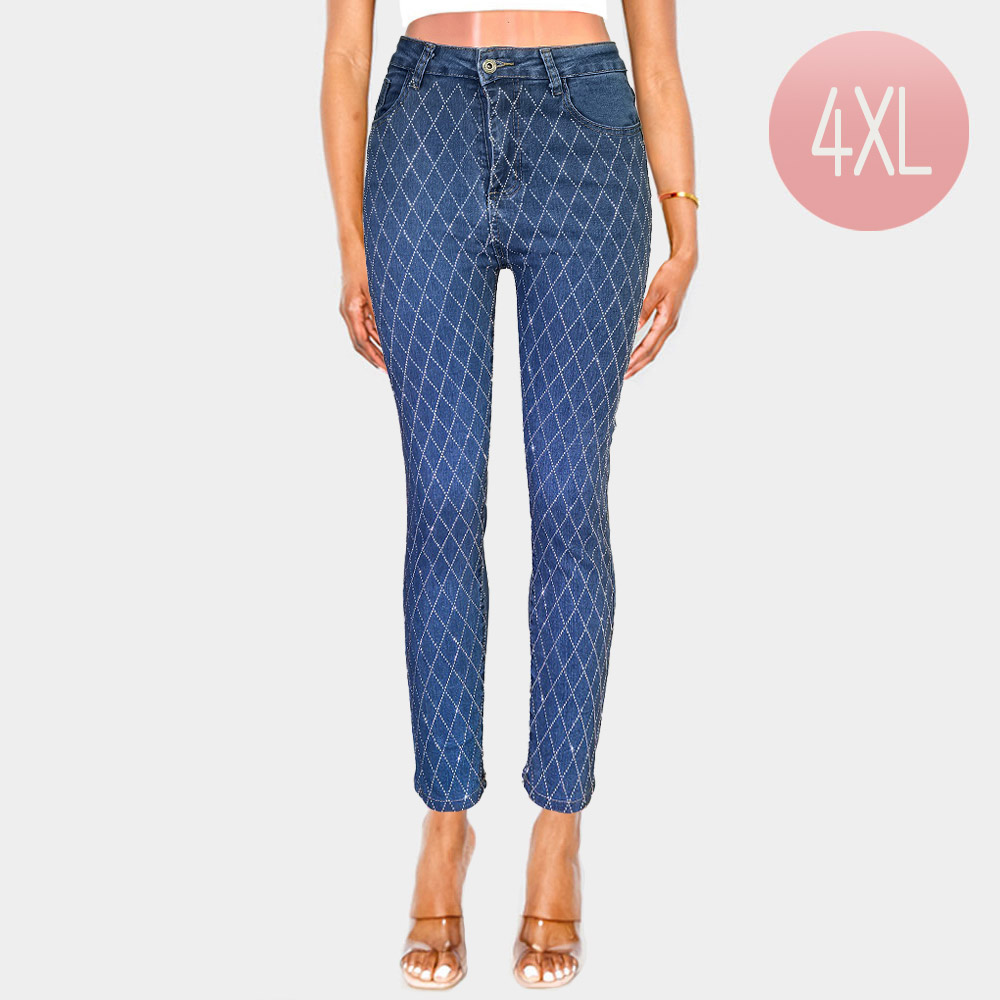 Details • Size : 4XL • Material : 67% Cotton, 20% Polyester, 11% Rayon, 2% Spandex • Hand Wash in Warm Water • Do not bleach / hang dry • Trendy high waist jeans featuring a sleek slim fit and an all-over diamond pattern stitch detail. Designed for both comfort and style, these pants elevate casual looks with a modern, flattering silhouette.