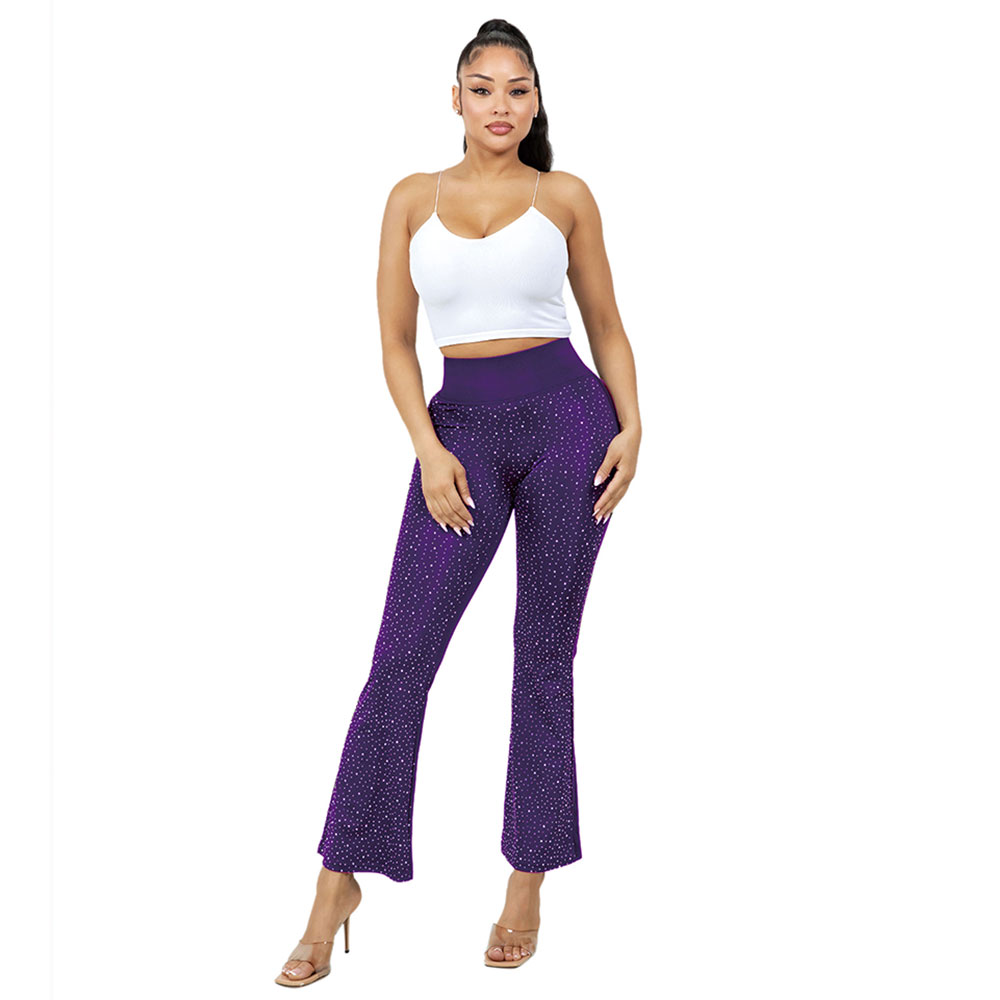 Details • Size : XL-2XL • Material : 92% Polyester, 8% Spandex • Big Stone FRONT Only • Hand Wash in Warm Water • Do not bleach / hang dry • Stylish purple flare leggings with sparkly detail and a comfy high-rise waistband. Designed for XL/2XL curves with flattering stretch and shine.