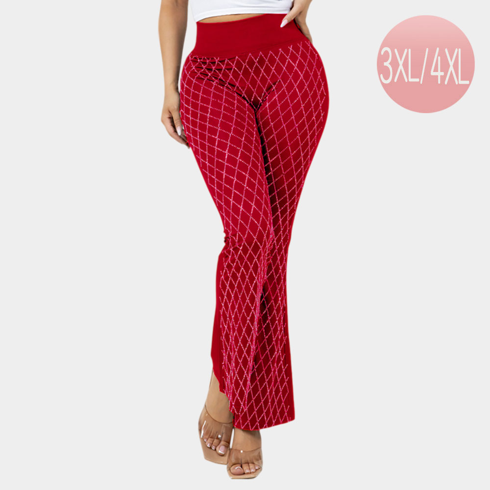 Details • Size : 3XL-4XL • Material : 92% Polyester, 8% Spandex • Stone FRONT Only • Hand Wash in Warm Water • Do not bleach / hang dry • Chic leggings with a white diamond grid print and flared legs. Designed for 3XL/4XL fit with a supportive high-rise waistband for all-day comfort and style.