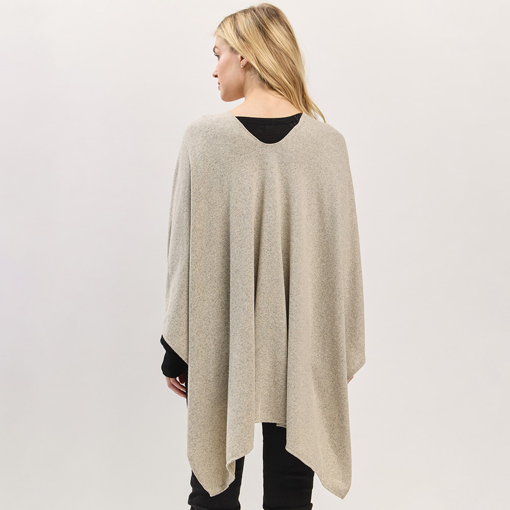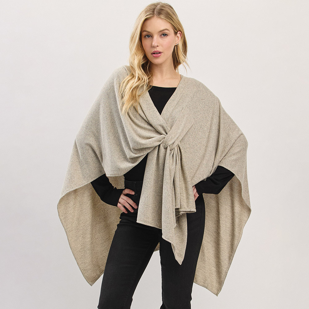 Details • Size : 46" X 28" • Material : 100% Polyester • Elevate your layering with this chic tie-front poncho wrap featuring a draped silhouette and asymmetrical hem. Stylish and cozy, it's perfect for transitional weather, casual days, or adding flair to any outfit.