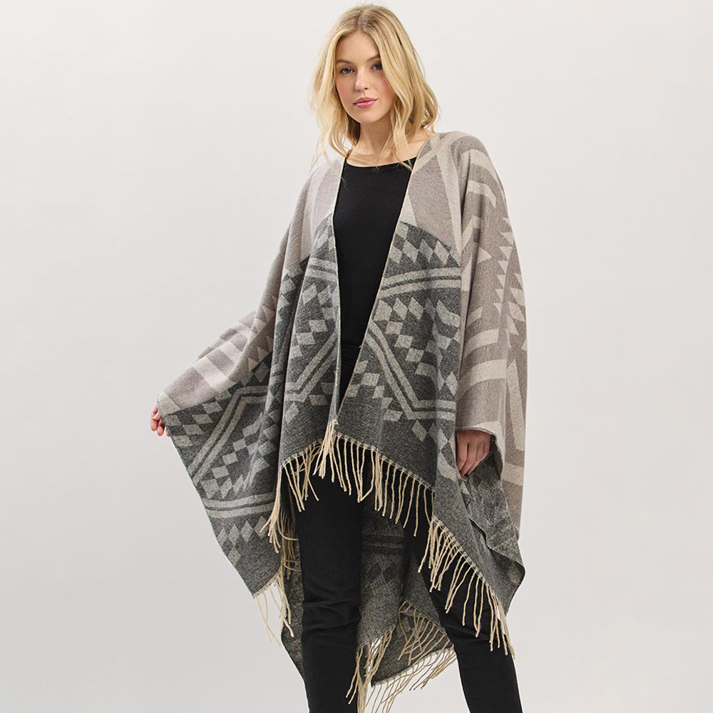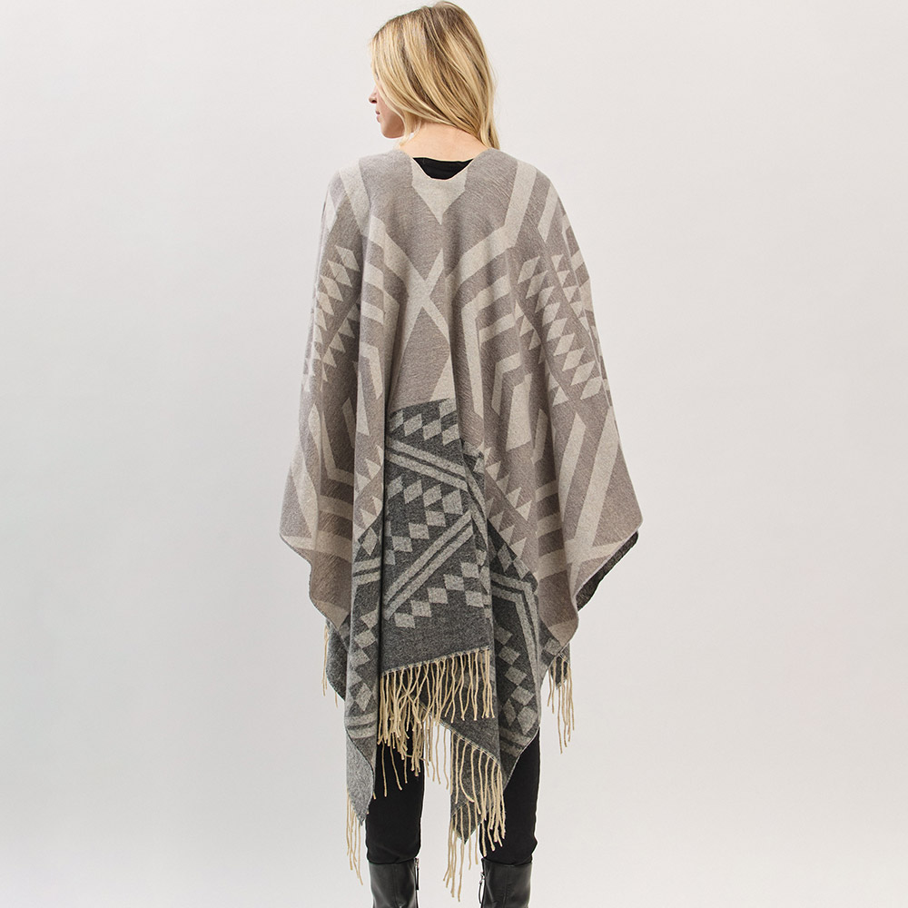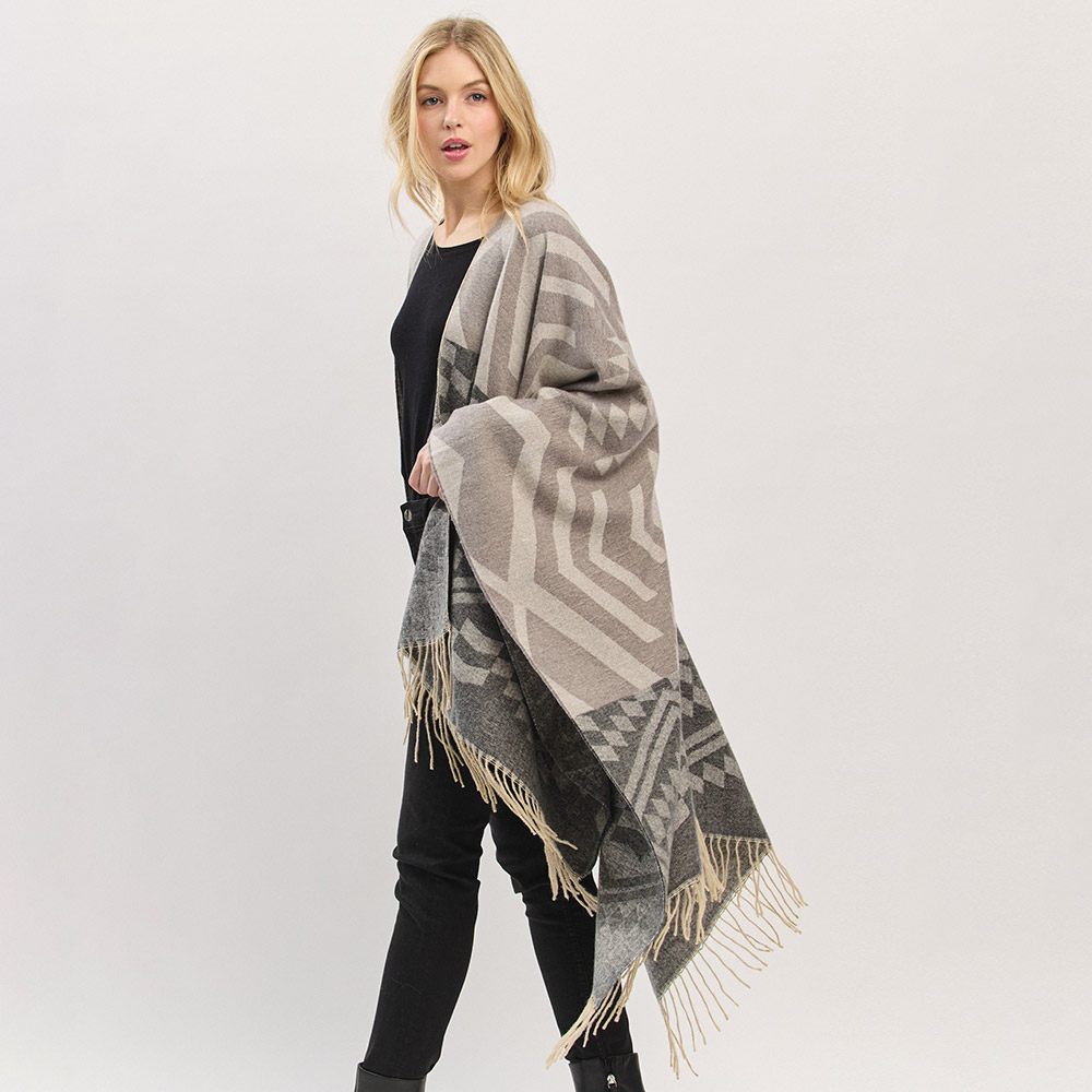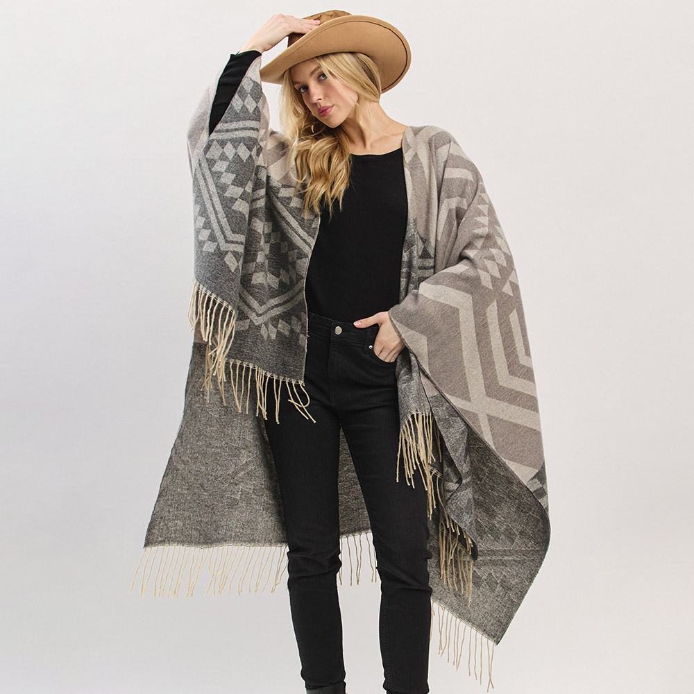 Details • Size : 56" X 33.5" • Material : 100% Polyester • Elevate your outerwear with this geometric print fringe shawl cape. Designed for cozy layering with a relaxed drape and eye-catching pattern, it blends comfort and western-inspired flair—perfect for casual styling, travel, or adding warmth with a fashion-forward edge.
