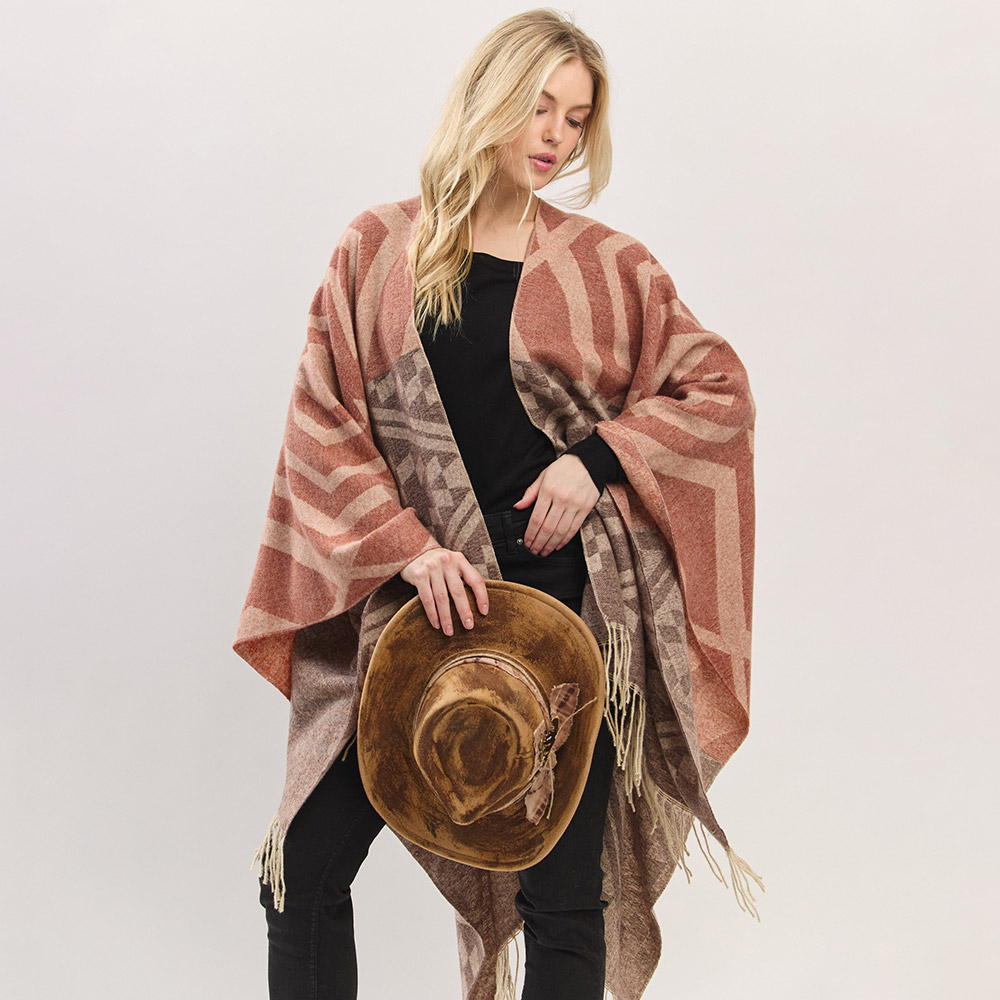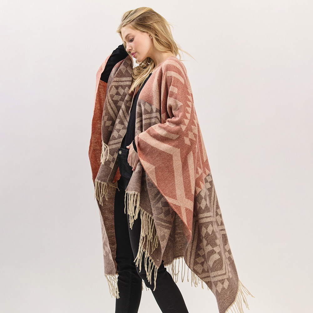 • Elevate your outerwear with this geometric print fringe shawl cape. Designed for cozy layering with a relaxed drape and eye-catching pattern, it blends comfort and western-inspired flair—perfect for casual styling, travel, or adding warmth with a fashion-forward edge.