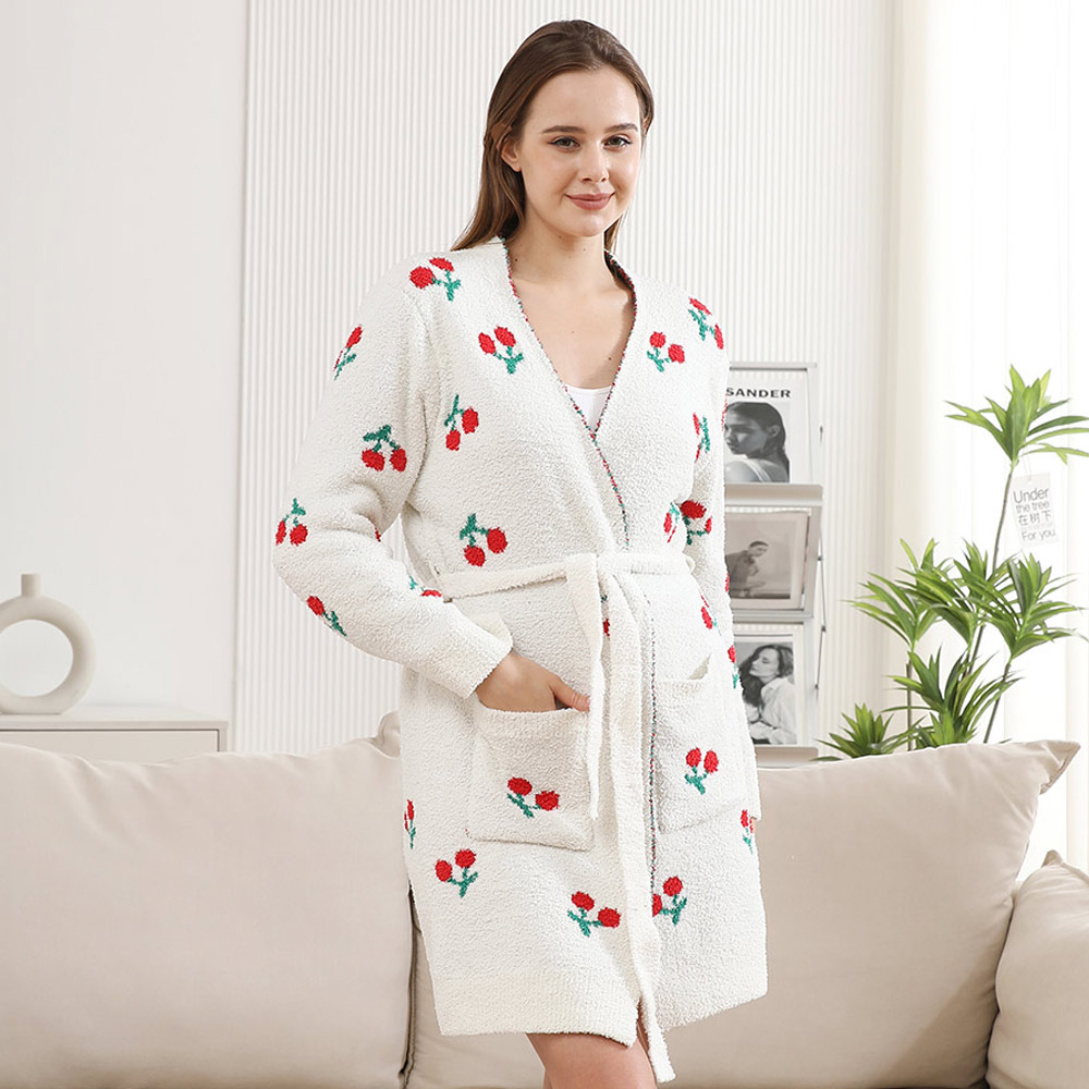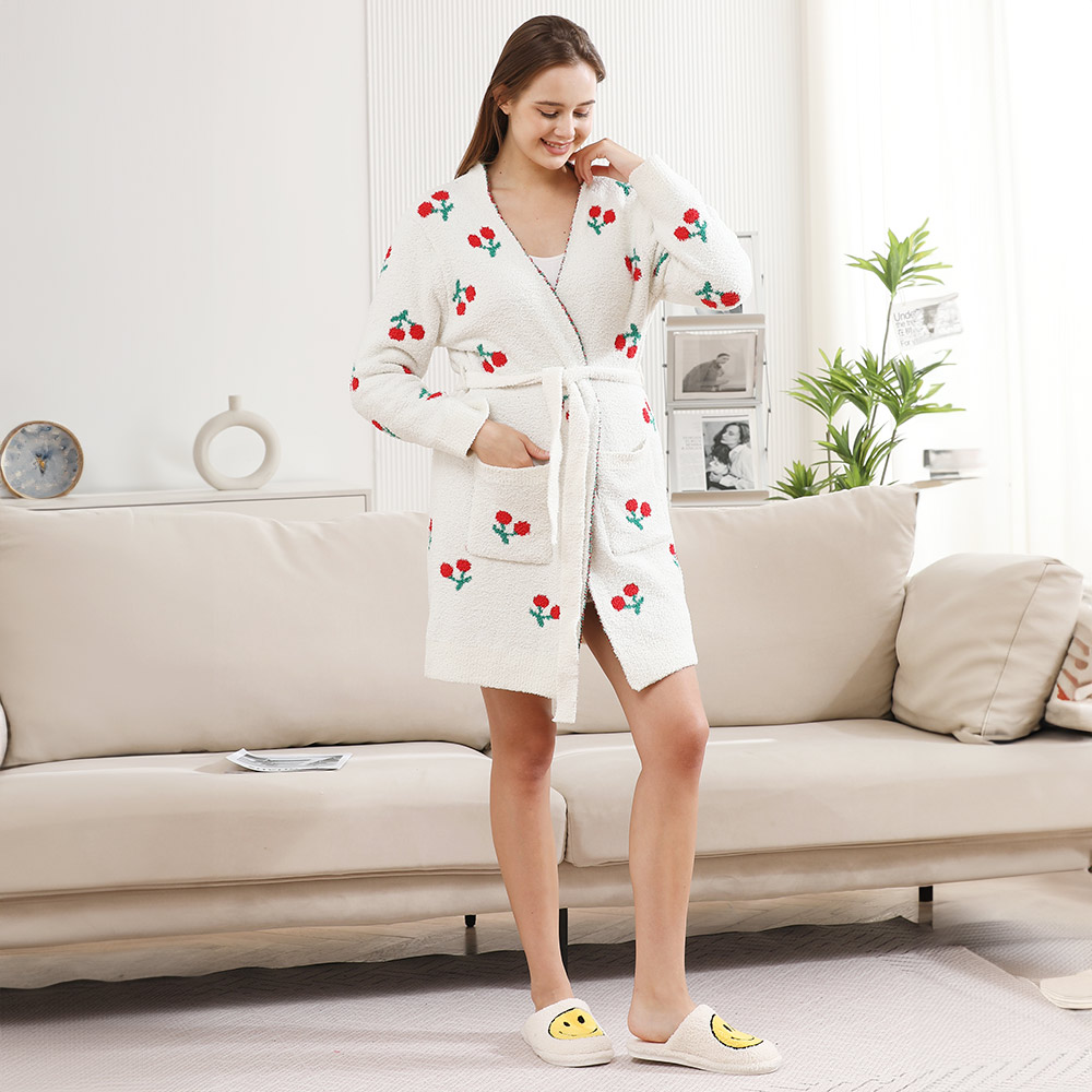 Details • Size : One Size • Material : 100% Poly Microfiber • Wrap yourself in comfort with this charming cherry knit robe. Designed with a belted waist, roomy pockets, and a relaxed fit, it blends warmth with a touch of fun. Perfect for lounging or adding playful flair to your at-home style, making cozy moments even sweeter.