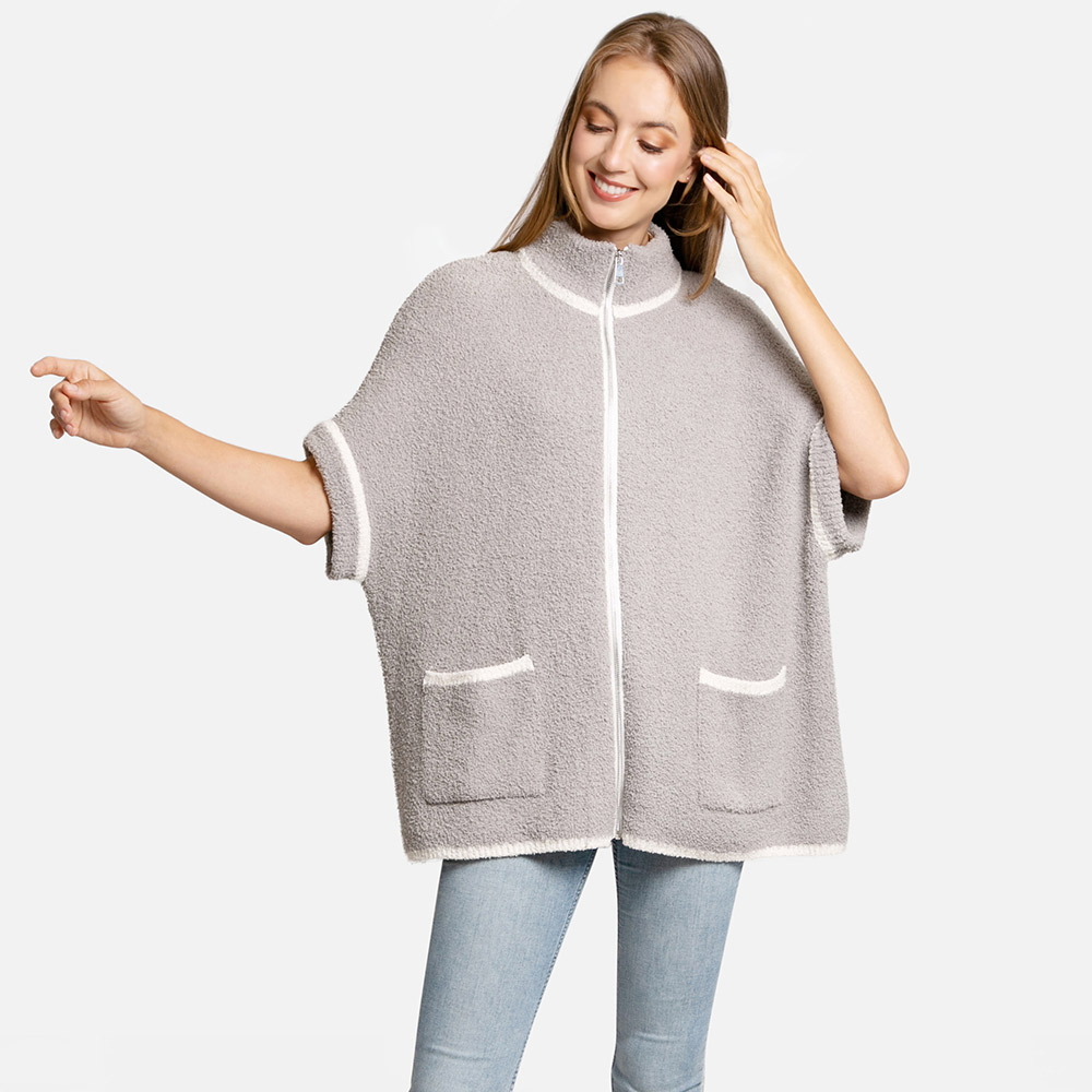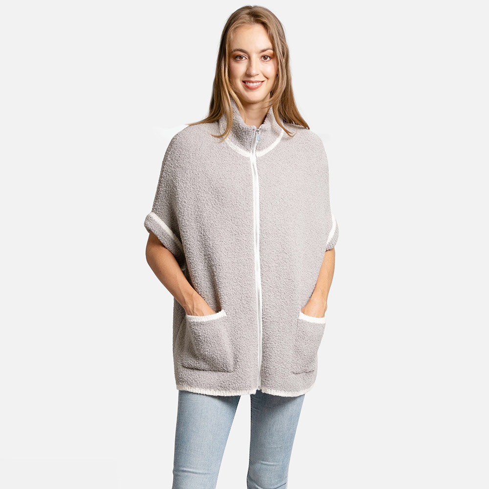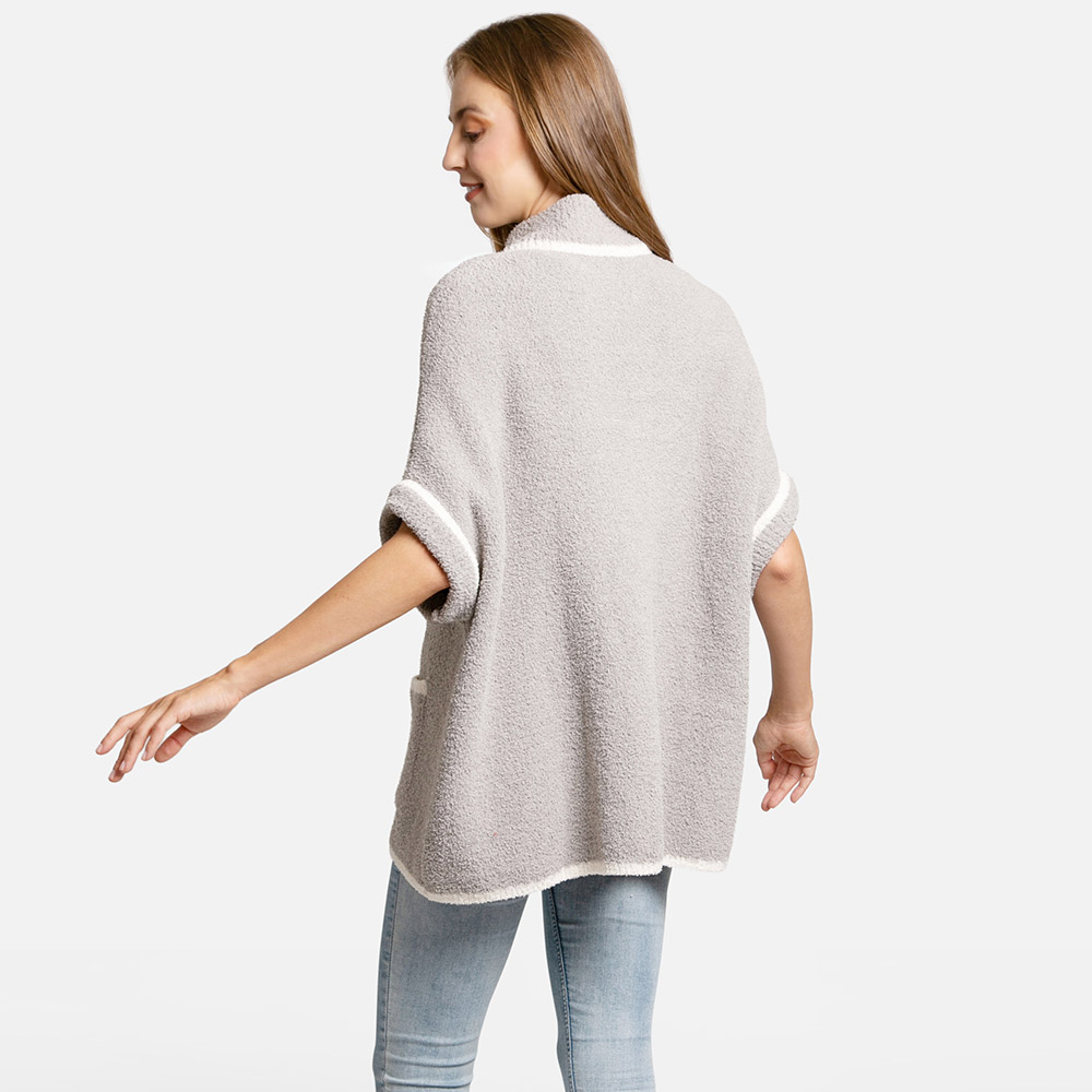 • Elevate your layering with this open-front cozy knit cape featuring convenient pockets and a relaxed silhouette. Perfect for transitional weather or lounging, this chic wrap combines warmth and effortless elegance.