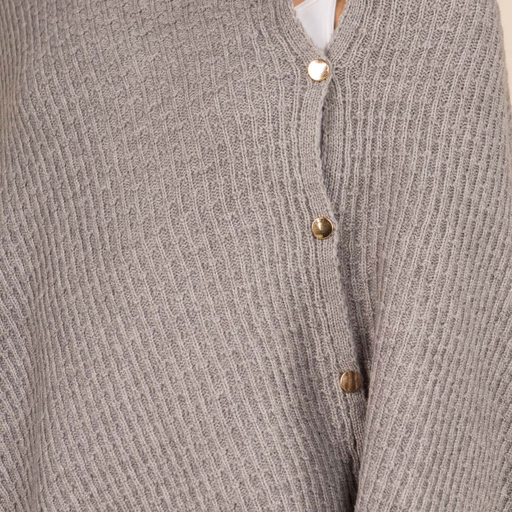 Details • Size : One Size • Material : 100% Acrylic • Wrap yourself in cozy texture with this button-up knit shawl that effortlessly transforms into a stylish poncho. The textured finish and structured drape offer timeless warmth and versatility for everyday layering or elegant evening looks.