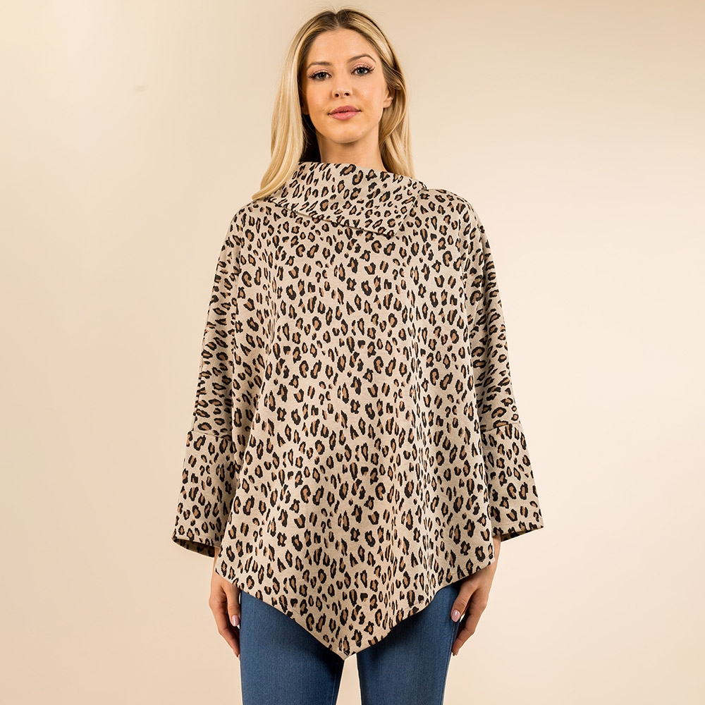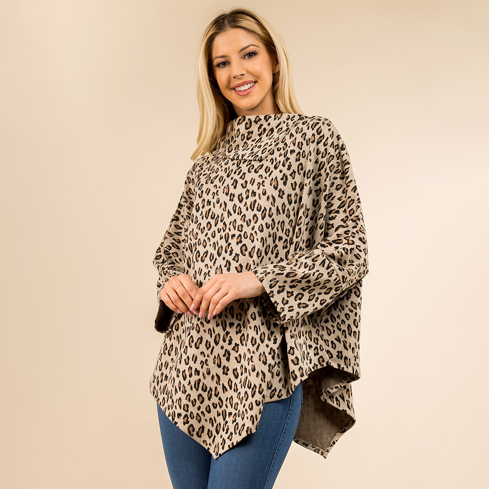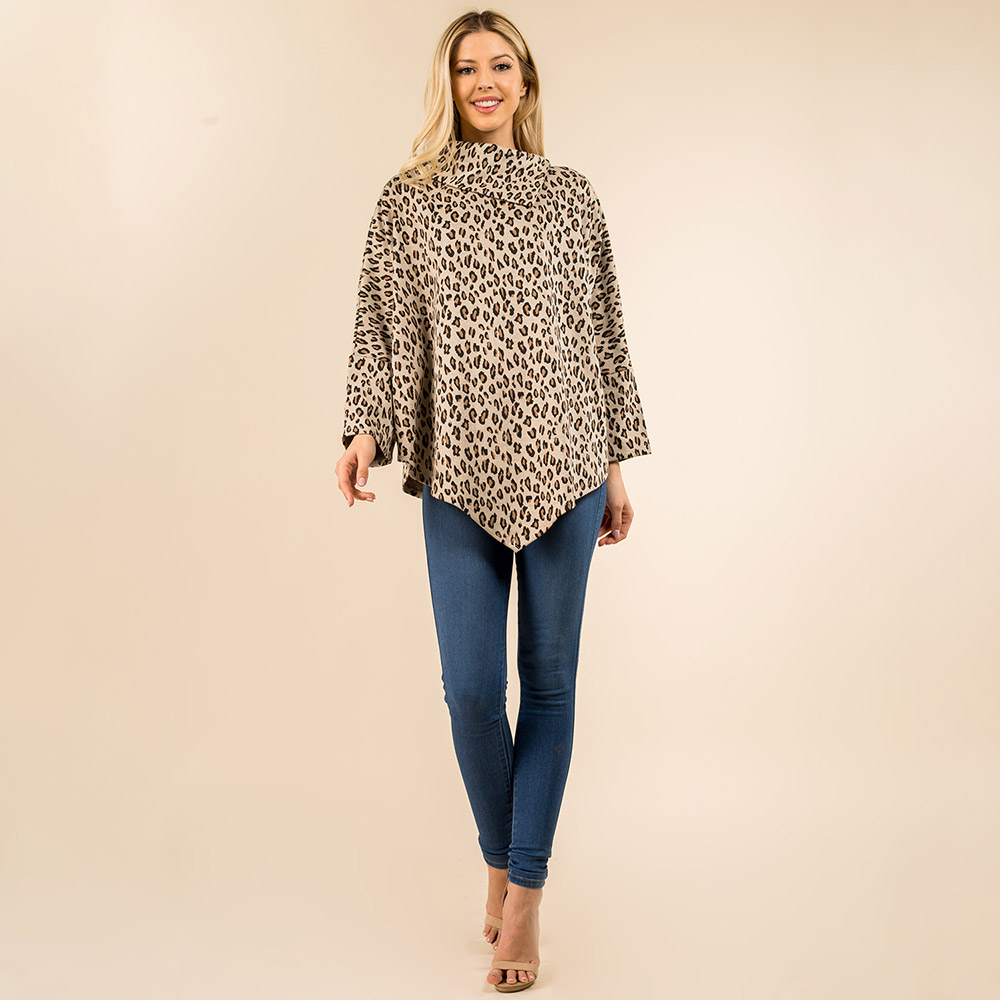 Details • Size : One Size • Material : 100% Acrylic • Turn heads in this chic leopard print poncho, perfect for layering during chilly days. With its relaxed fit and soft fabric, this one-size wrap adds effortless elegance and warmth to your everyday style. A versatile piece ideal for casual outings or dressy fall looks.