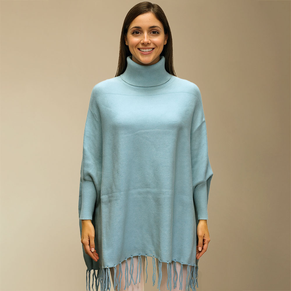 • Stylish turtleneck poncho featuring a relaxed silhouette and flowing fringe hem, designed for easy layering and everyday comfort. Its soft drape and refined details create a chic look perfect for casual outings or polished ensembles.