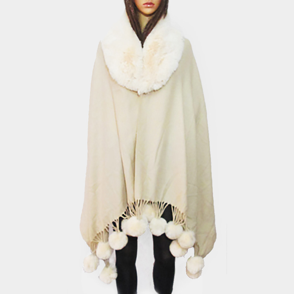 Faux Fur Collar and Pom Pom Dangle Poncho