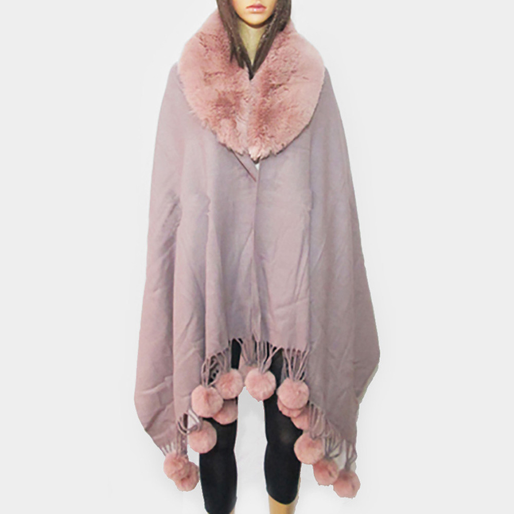Faux Fur Collar and Pom Pom Dangle Poncho