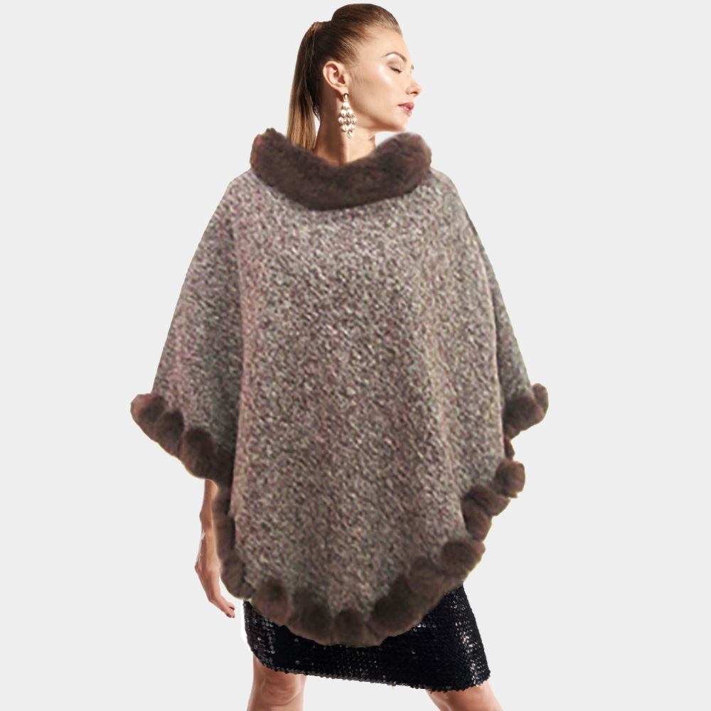 Fur Strap Trim Solid Knit Ruana Poncho