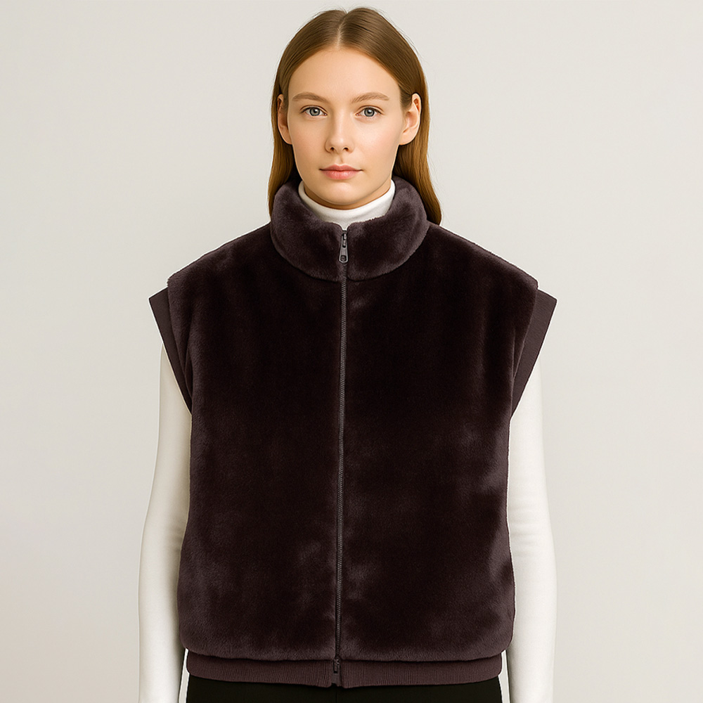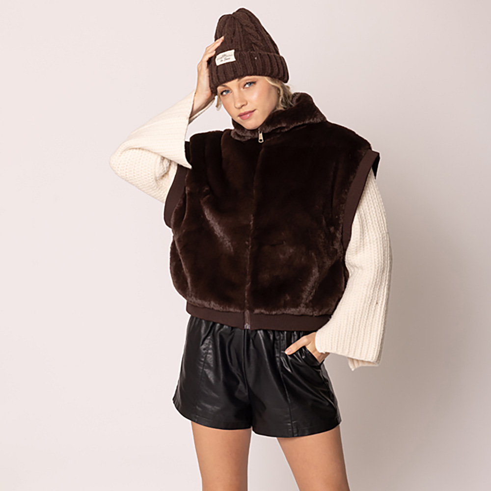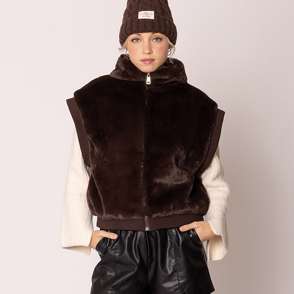 Details • Size : 22" X 21.7" • Material : 100% Polyester • Stay cozy and chic in this sleeveless faux fur vest with a full zipper front and high collar. Perfect for layering over sweaters or tops, it adds warmth and modern elegance to casual and dressy looks. A versatile outerwear piece designed for style and comfort in any season.