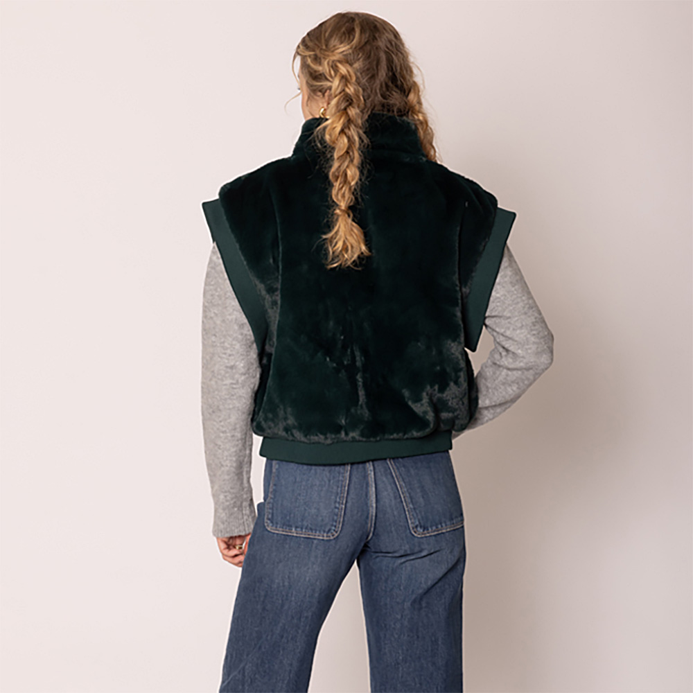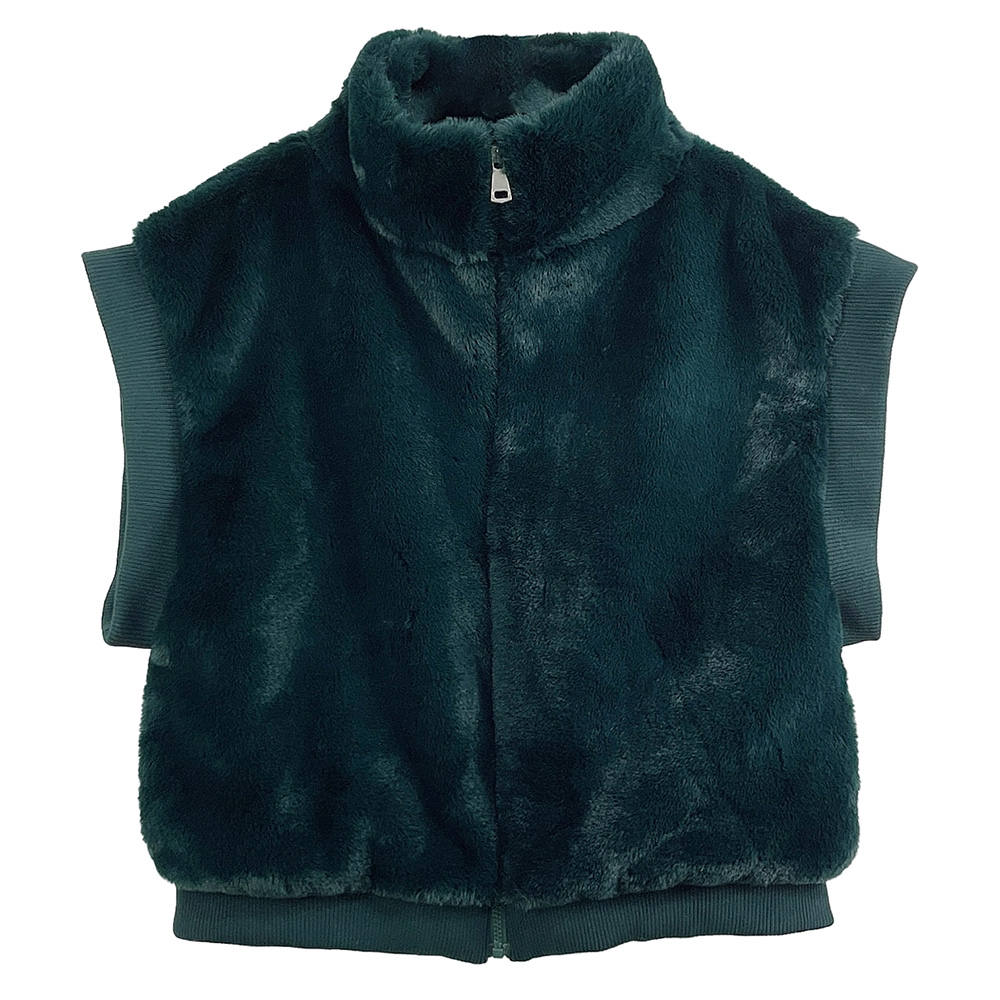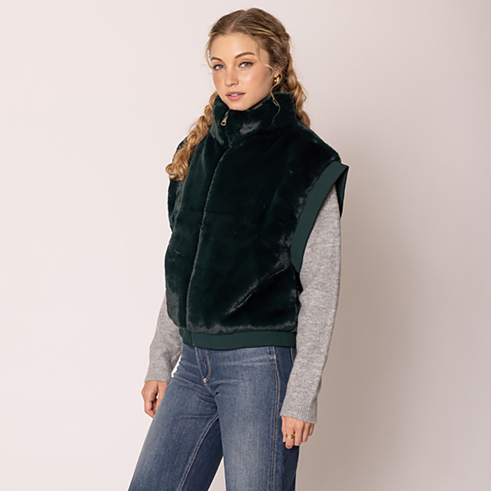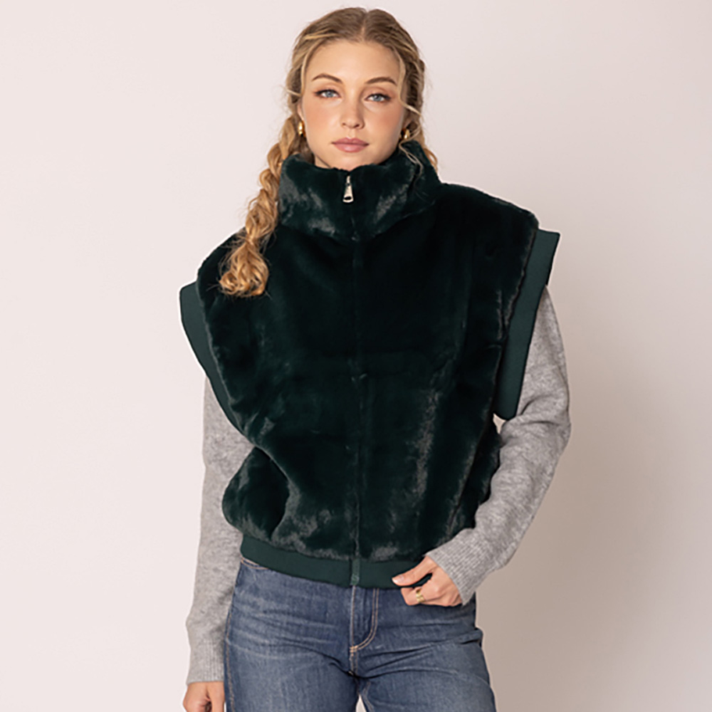 Details • Size : 22" X 21.7" • Material : 100% Polyester • Stay cozy and chic in this sleeveless faux fur vest with a full zipper front and high collar. Perfect for layering over sweaters or tops, it adds warmth and modern elegance to casual and dressy looks. A versatile outerwear piece designed for style and comfort in any season.