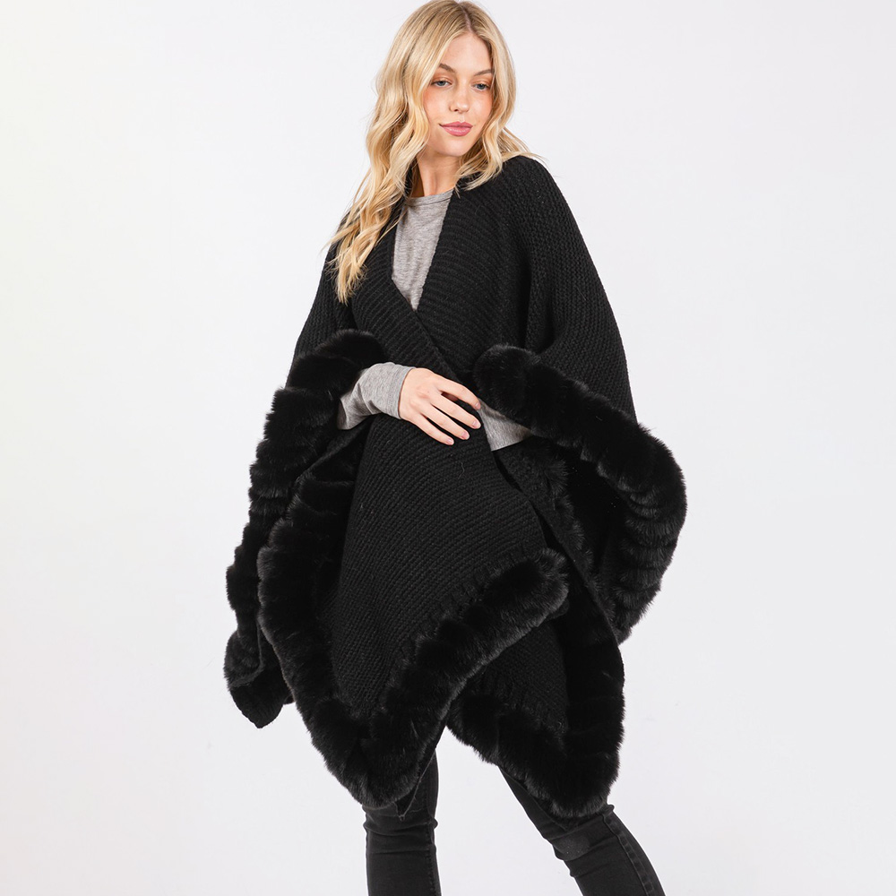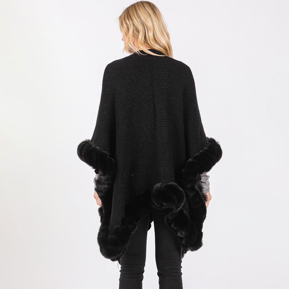 Details • Size : 27.5" X 37" • Material : 80% Acrylic, 20% Polyester • Luxurious knit poncho cape with a plush faux fur trim, offering a cozy yet polished look for chilly days. Its flowing silhouette and textured design provide effortless layering for both casual and dressed-up outfits.
