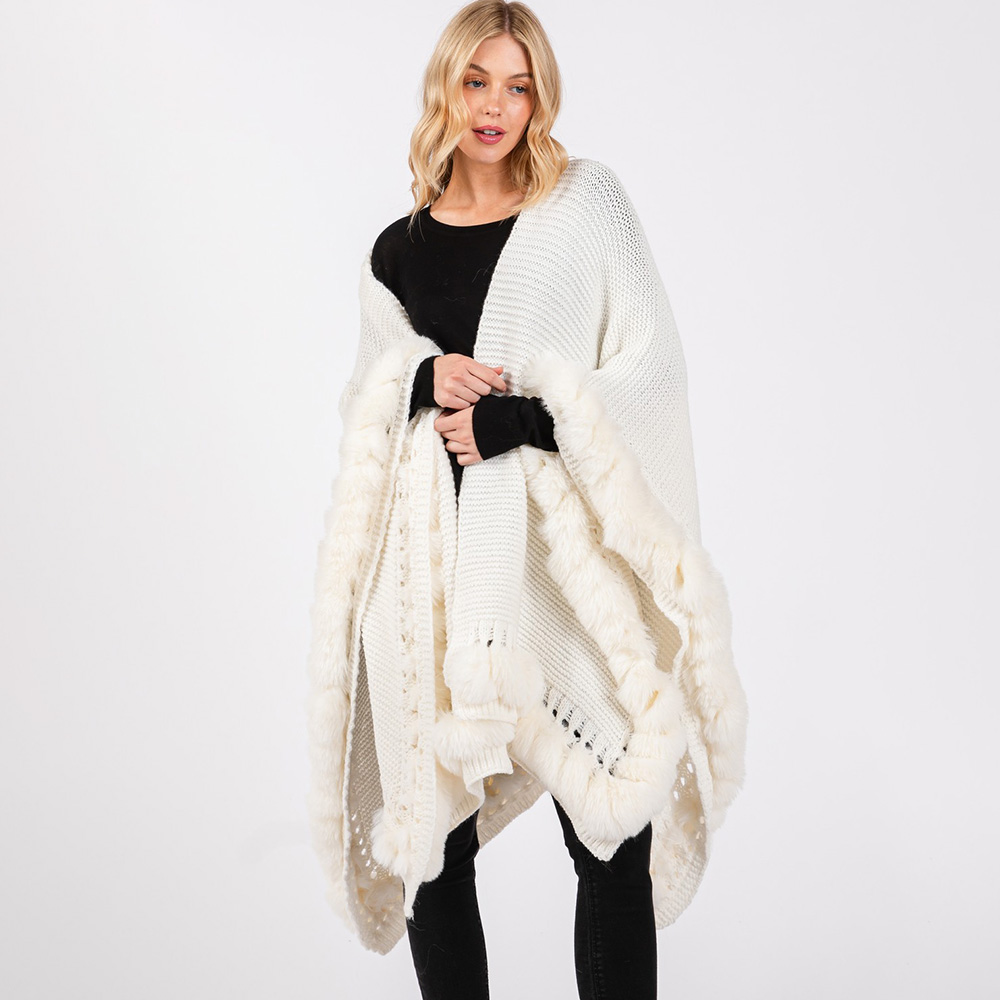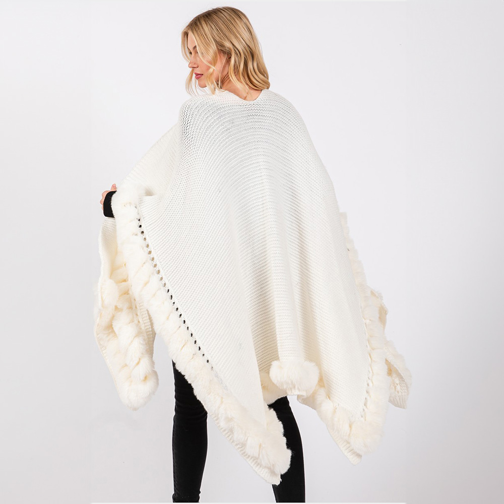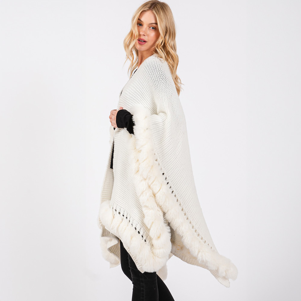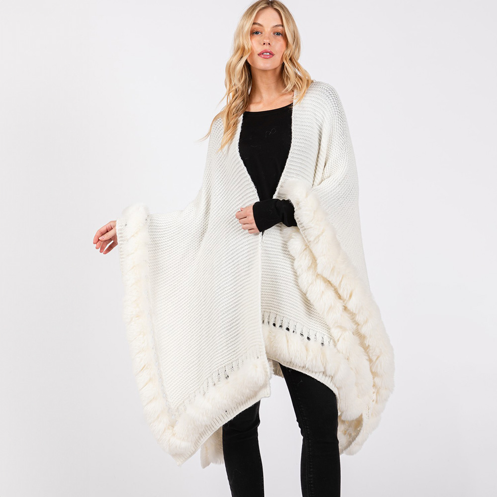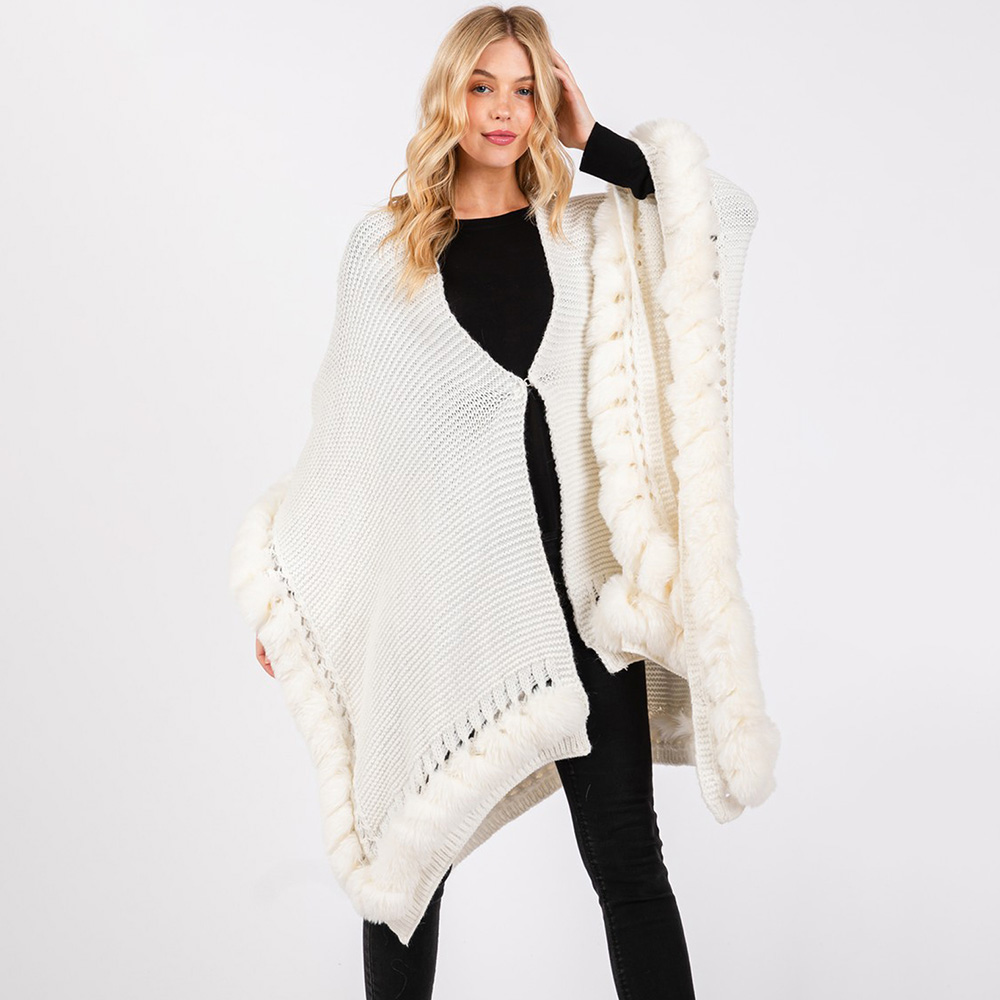• Luxurious knit poncho cape with a plush faux fur trim, offering a cozy yet polished look for chilly days. Its flowing silhouette and textured design provide effortless layering for both casual and dressed-up outfits.