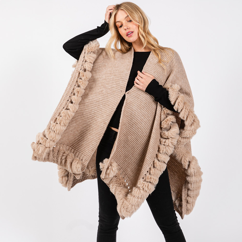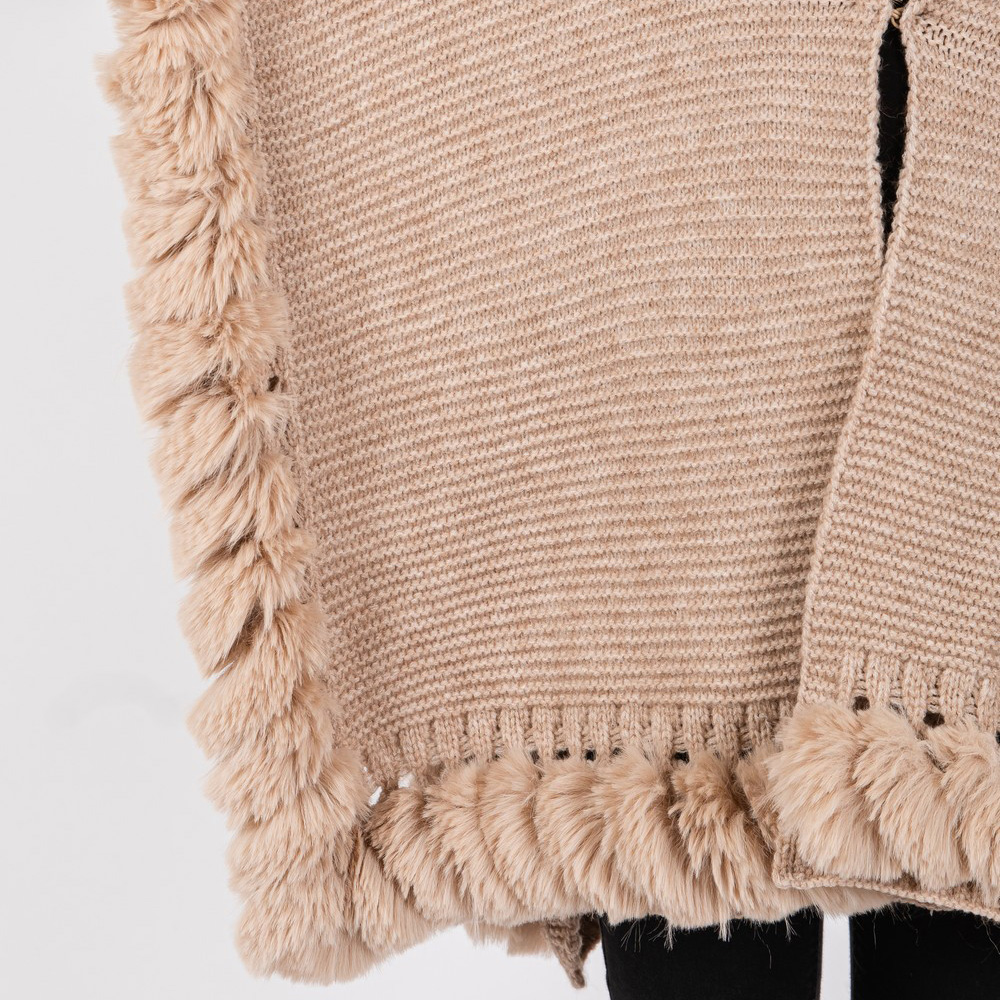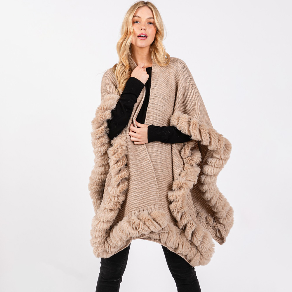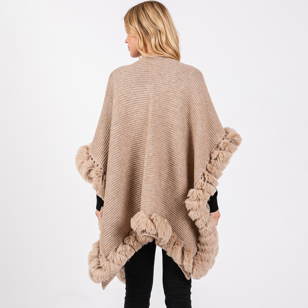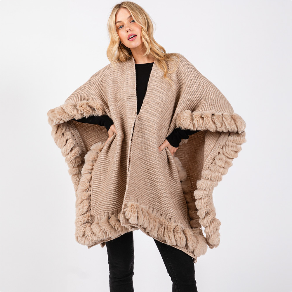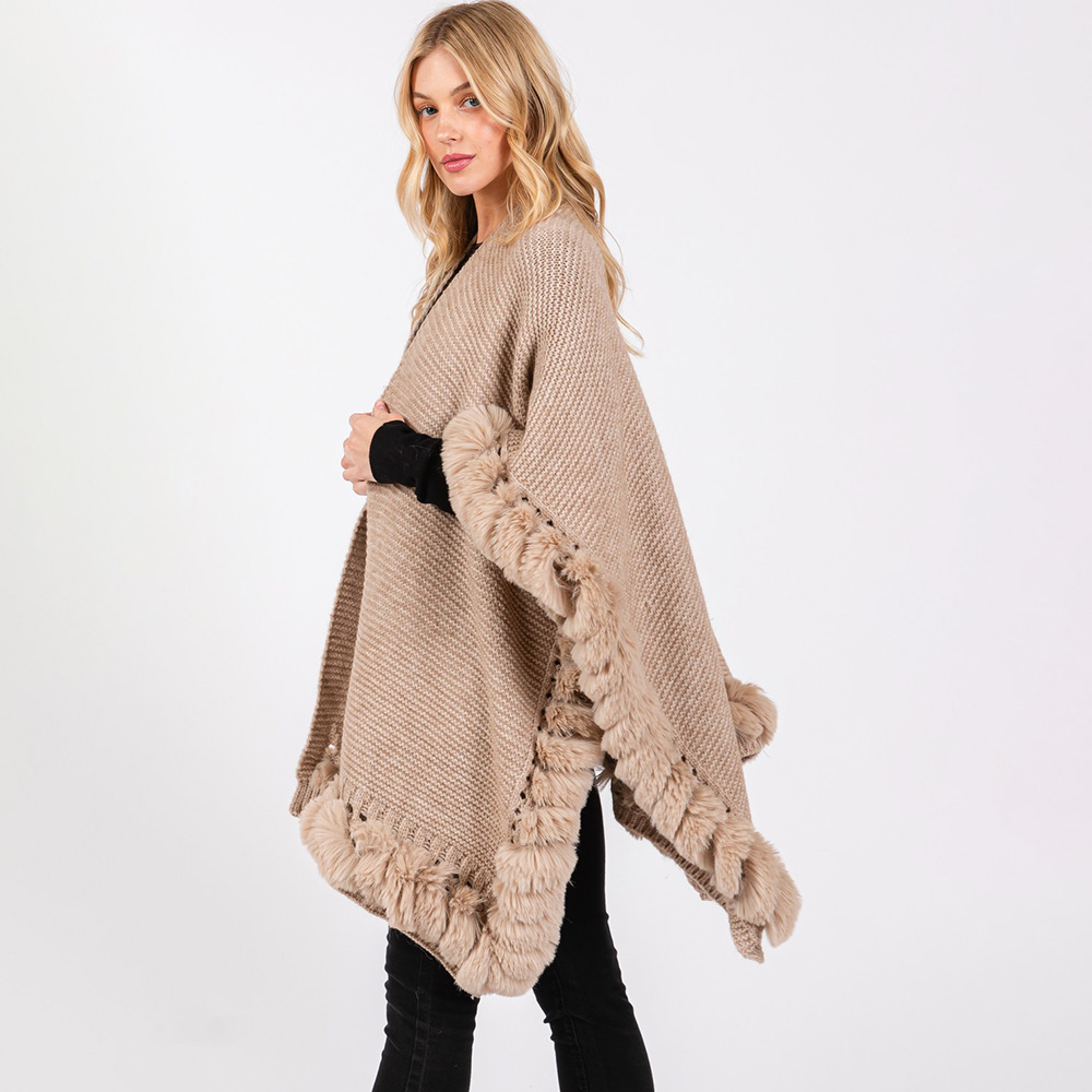 • Luxurious knit poncho cape with a plush faux fur trim, offering a cozy yet polished look for chilly days. Its flowing silhouette and textured design provide effortless layering for both casual and dressed-up outfits.