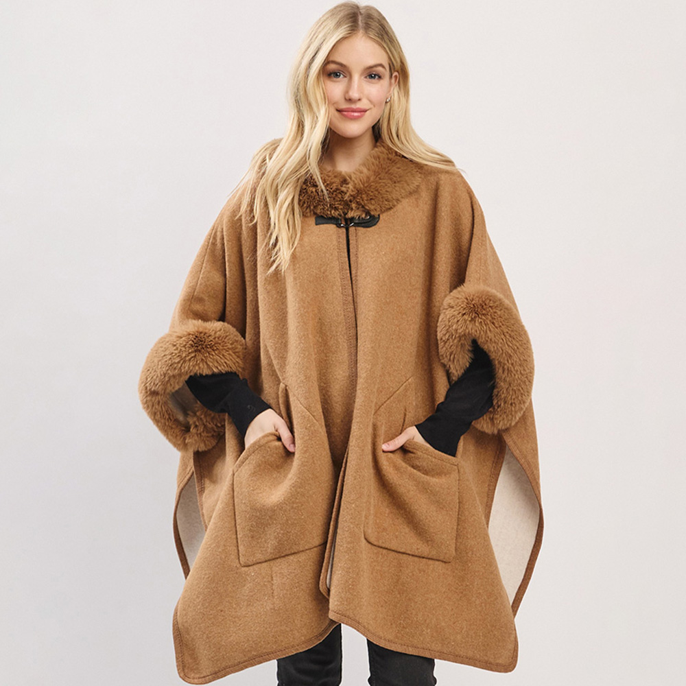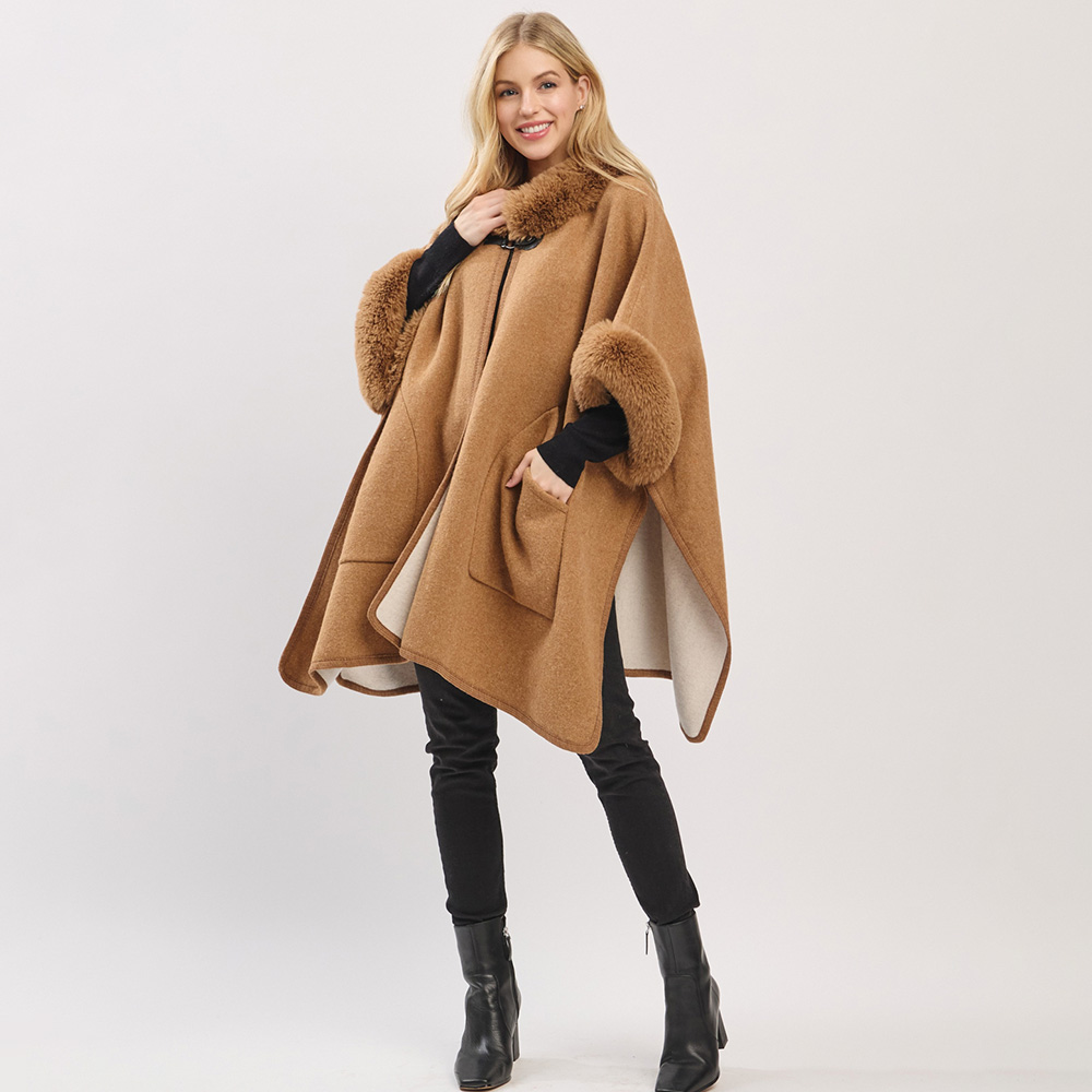 • Stay warm in style with this elegant cape wrap featuring plush faux fur trim, roomy front pockets, and a front clasp closure. A sophisticated outer layer perfect for chilly days, evening outings, or holiday looks.